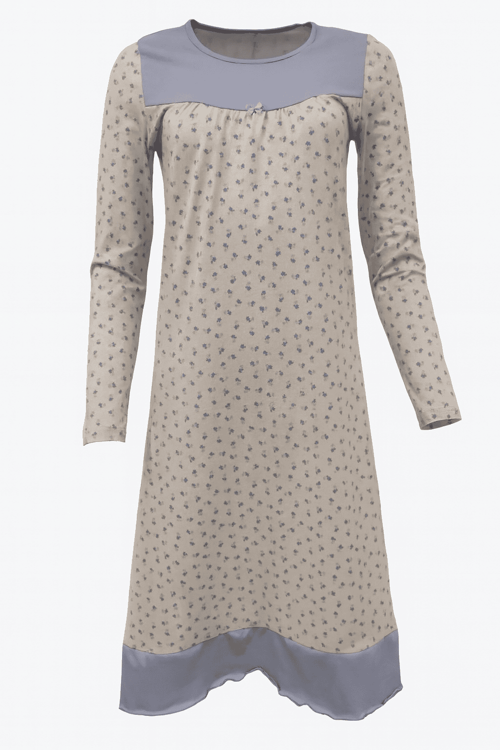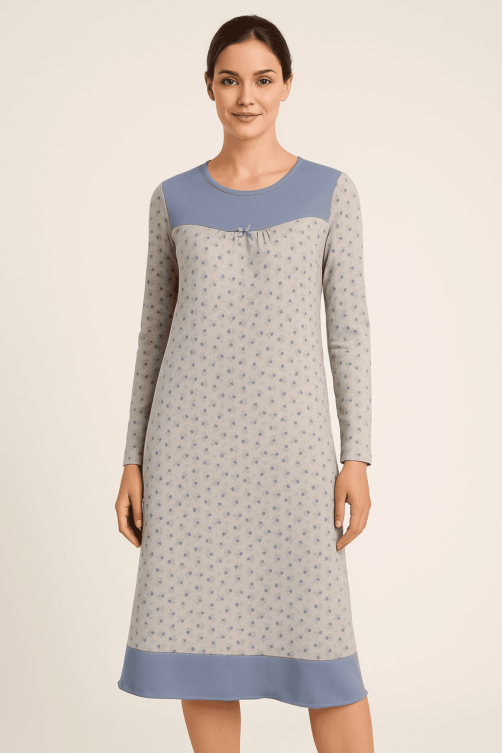 Bombažna spalna srajca ALENKA. Spalna srajca ima dolge rokave in okrogel ovratnik. Izdelana je iz prijetnega bombaža, ki dovoli da koža med spanjem diha in nudi 100% udobje. Bombažna spalna srajca ima na sredini dodano mašnjico. Spalna srajca je na voljo od konfekcijske velikosti 38 do 52. Bombažna spalna srajca je izdelana v Sloveniji