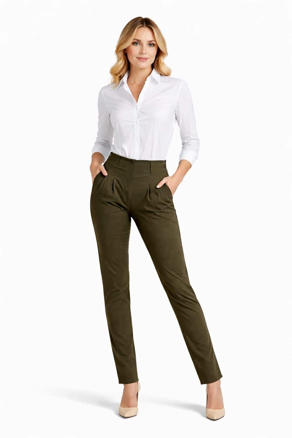 Odkrijte brezčasen slog s temi premium ženskimi hlačami z visokim pasom, ustvarjenimi za sodobne ženske, ki cenijo eleganco, kakovost in popolno prileganje. Minimalističen, a prefinjen dizajn omogoča, da so hlače idealna izbira za poslovne priložnosti, formalne dogodke ali elegantne vsakodnevne kombinacije.