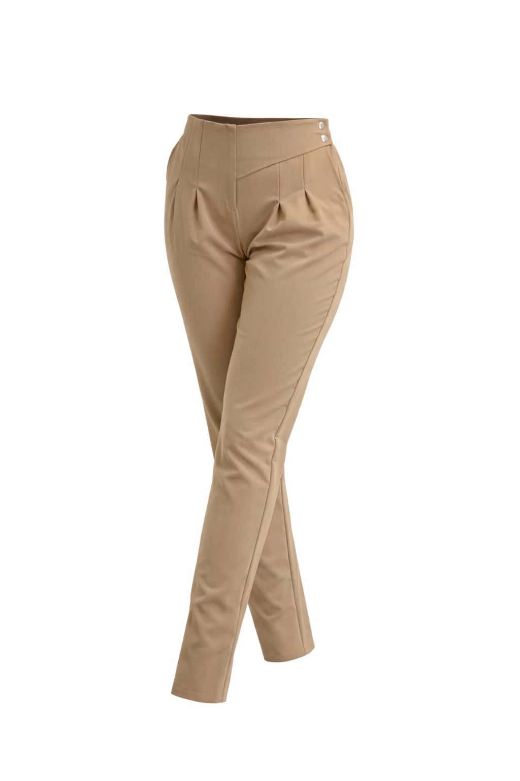 Hlače so izdelane iz kakovostnega in prijetnega materiala, ki zagotavlja udobje skozi ves dan. Visok pas lepo poudari silhueto, optično podaljša noge ter ustvari elegantno in ženstveno linijo. Poseben poudarek daje asimetričen preklop z dekorativnima gumboma, ki hlačam doda moderen in sofisticiran videz.