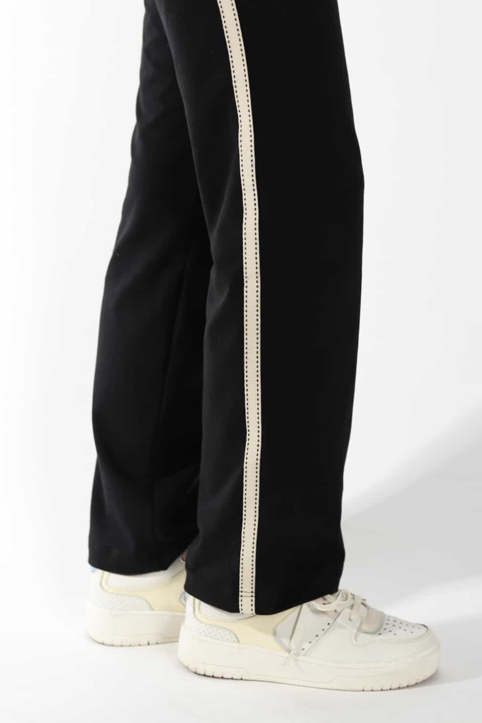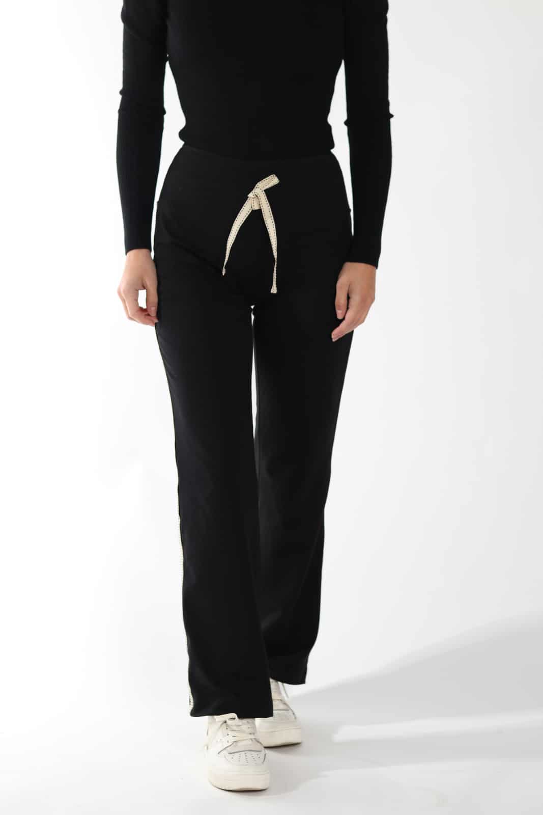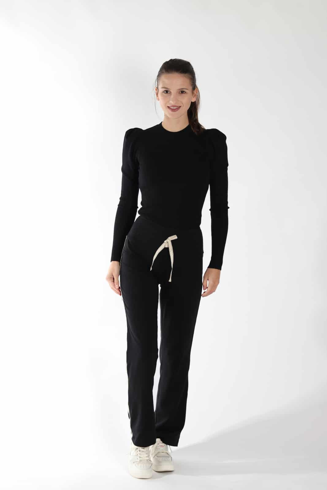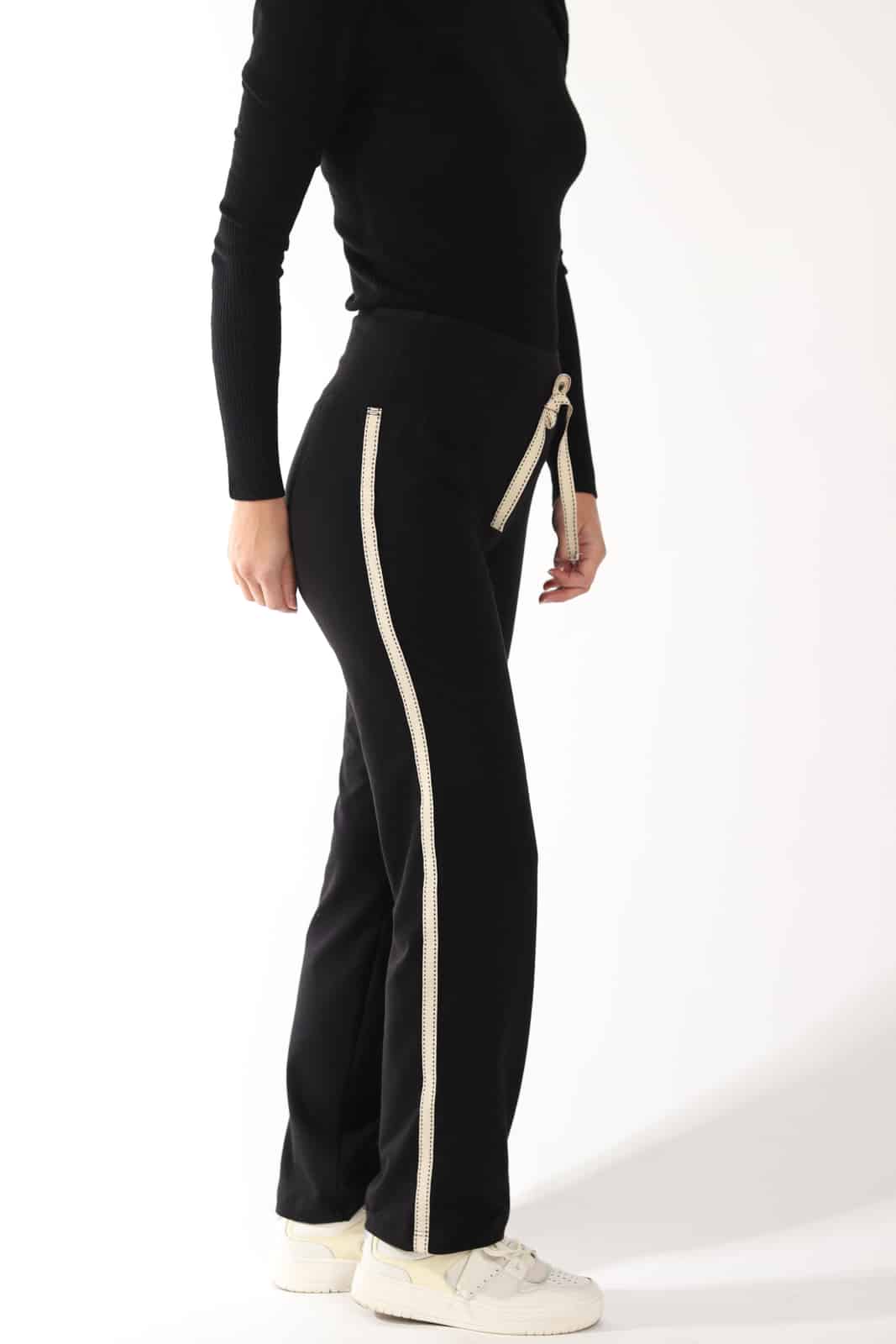 Modna in udobne hlače, izdelane iz kakovostnega bombaža. Hlače imajo višji pas, ob strani okrasni trak in ravno padajo. Hlače imajo na sredini okrasno vrvico, ki se zaveže na mašnjo. Hlače so izdelane v Sloveniji. Hlače lahko nosimo tako za boj fino, kot tudi za na sprehod ali kot trenirko, saj so izredno udobne. Hlače vam lahko popolnoma prilagodimo vašim meram, na voljo pa so v standardnih konfekcijskih številkah – od 34 do 50.