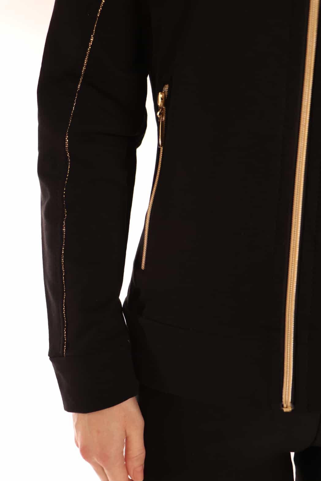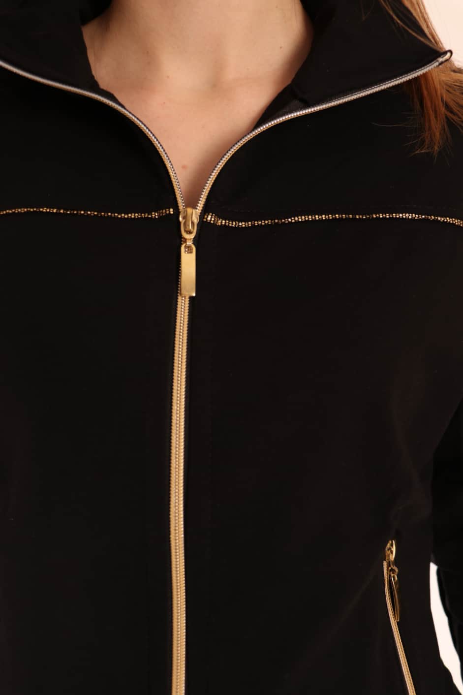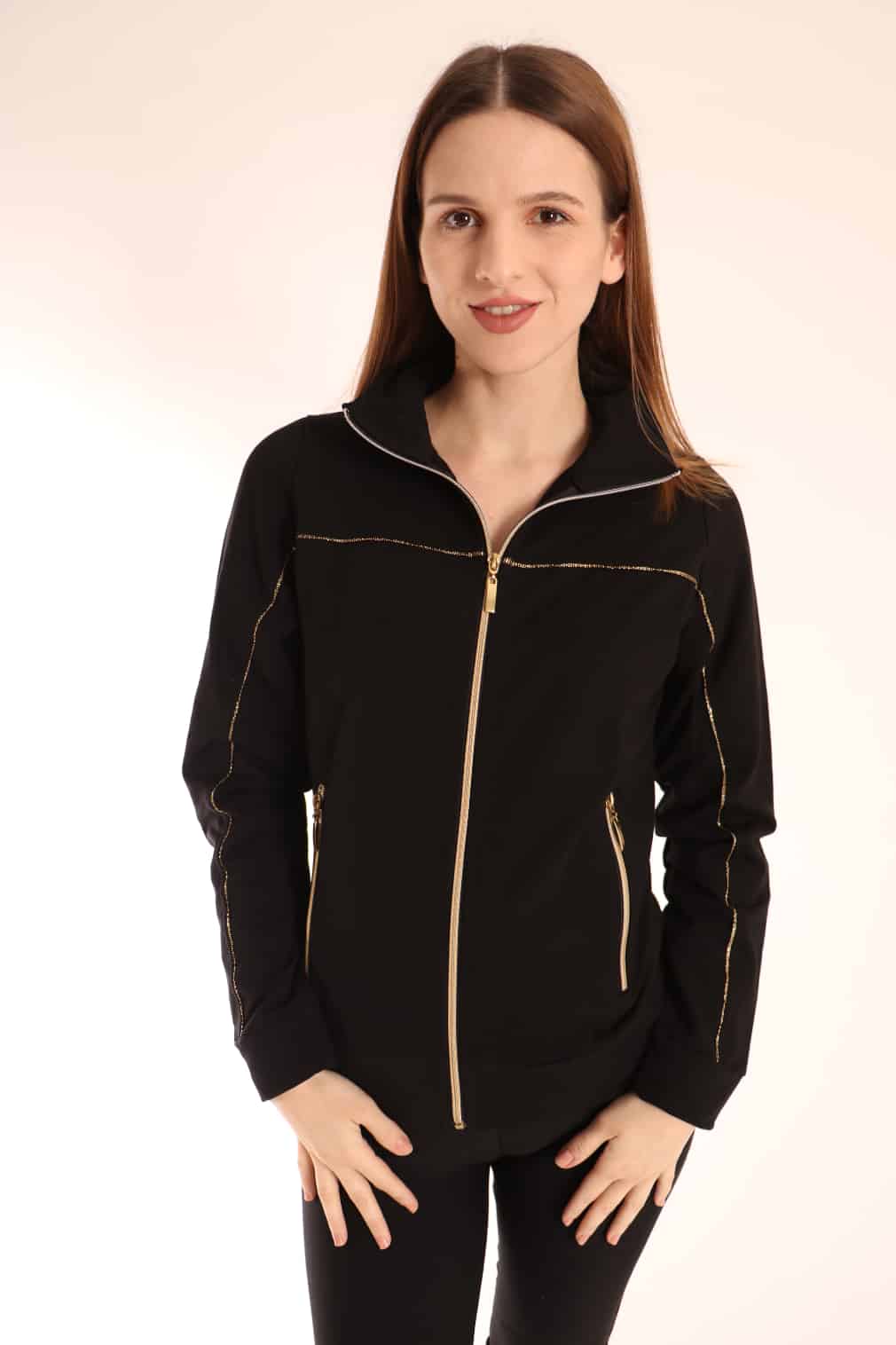 Jopa BERNA, v črno zlati barvi z dolgimi rokavi. Jopa je brez kapuce in je na zadrgo v srebrni barvi. Prav tako ima dva žepka z zadrgo. Na rokavih in sprednji strani ima jopa zlat trak, ki je zelo lep detajl in jopo naredi zanimivo. Jopo lahko nosimo ob bolj športnih aktivnostih kot tudi za vsakodnevno nošenjo.