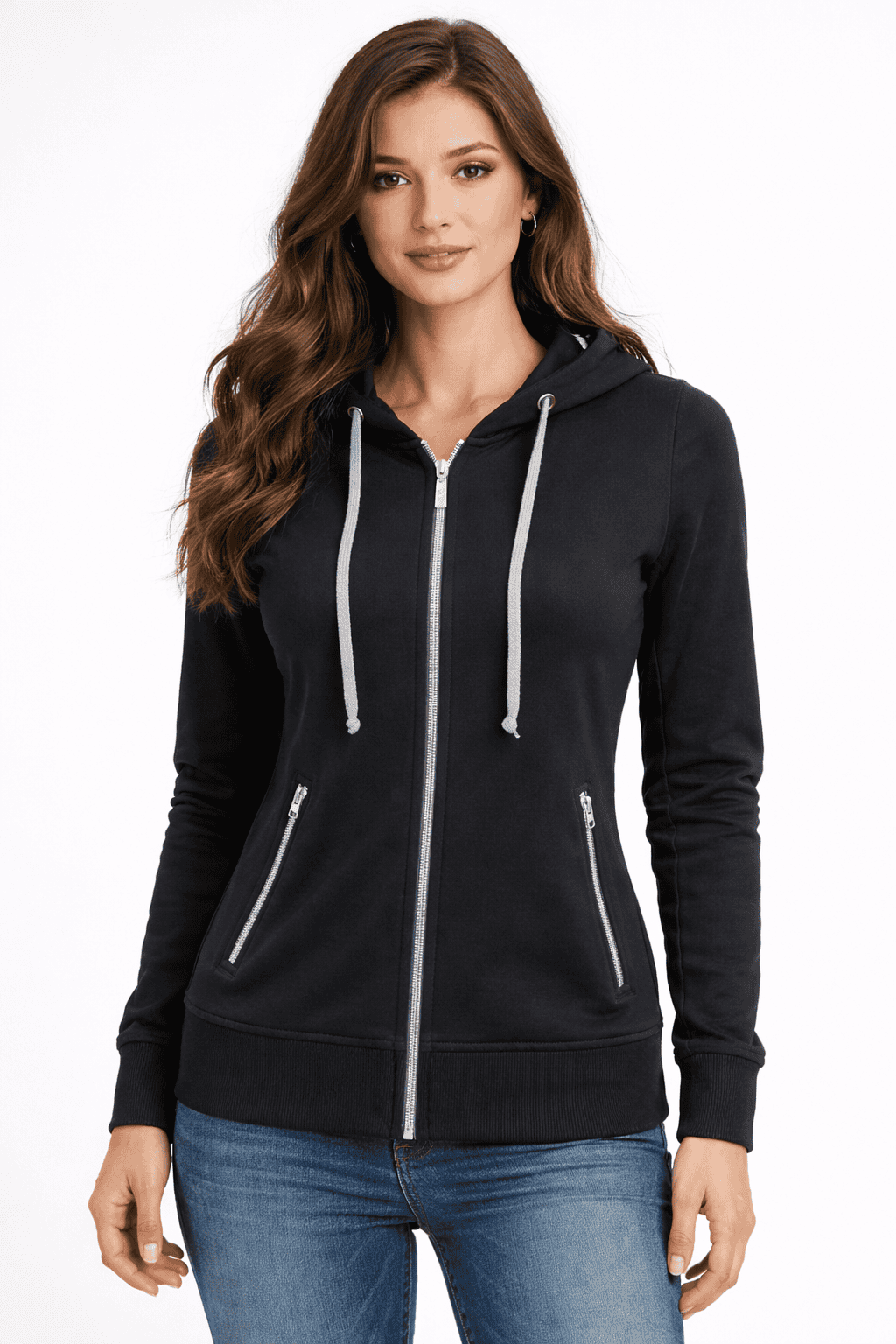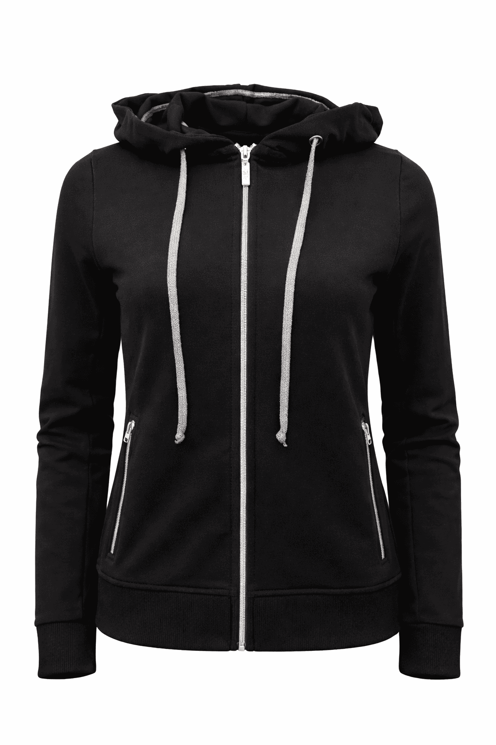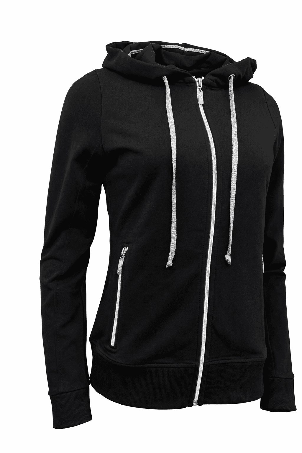Športno-elegantna ženska zgornja jopica s kapuco v brezčasni črni barvi združuje udobje, funkcionalnost in moderen videz. Izdelana je iz kakovostnega, mehkega materiala, ki nudi prijeten občutek skozi ves dan. Poseben poudarek dajejo srebrni kovinski zadrgi spredaj in na žepih, ki jopici dodajo prefinjen in trendovski videz.