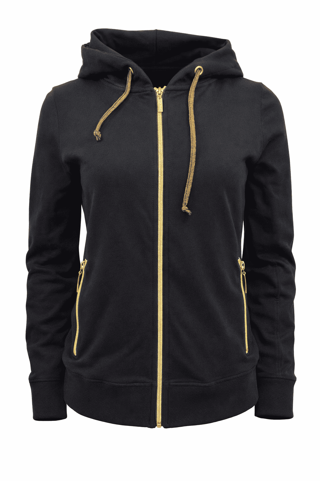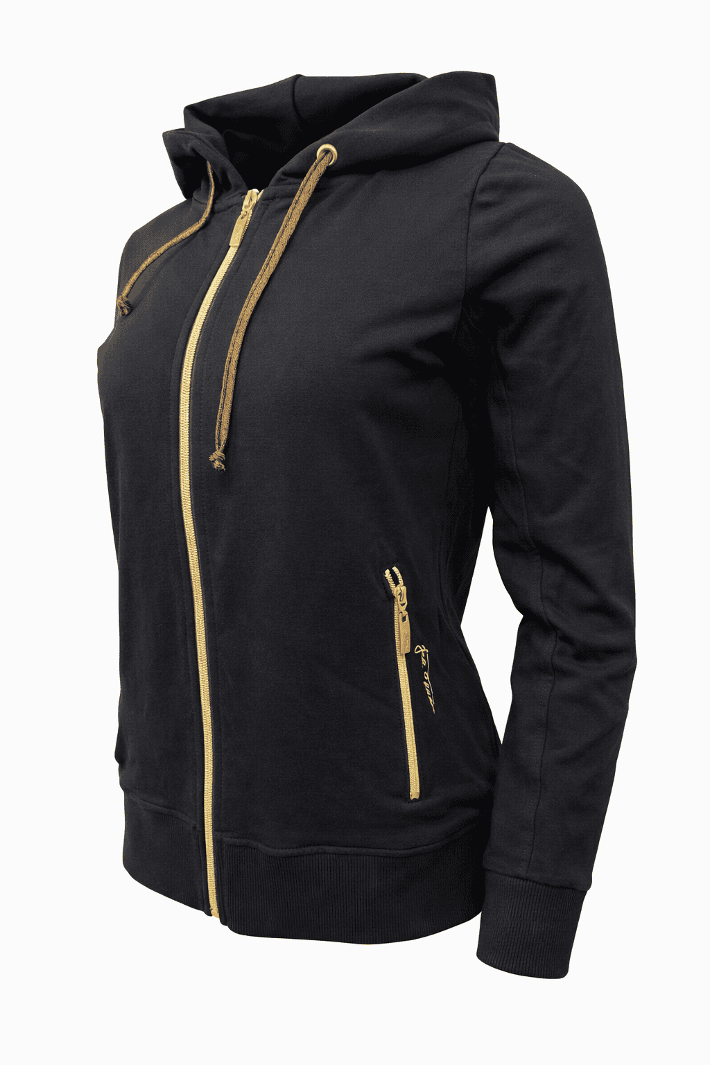 Športno-elegantna ženska zgornja jopica s kapuco v brezčasni črni barvi združuje udobje, funkcionalnost in moderen videz. Izdelana je iz kakovostnega, mehkega materiala, ki nudi prijeten občutek skozi ves dan. Poseben poudarek dajejo zlati kovinski zadrgi spredaj in na žepih, ki jopici dodajo prefinjen in trendovski videz.
