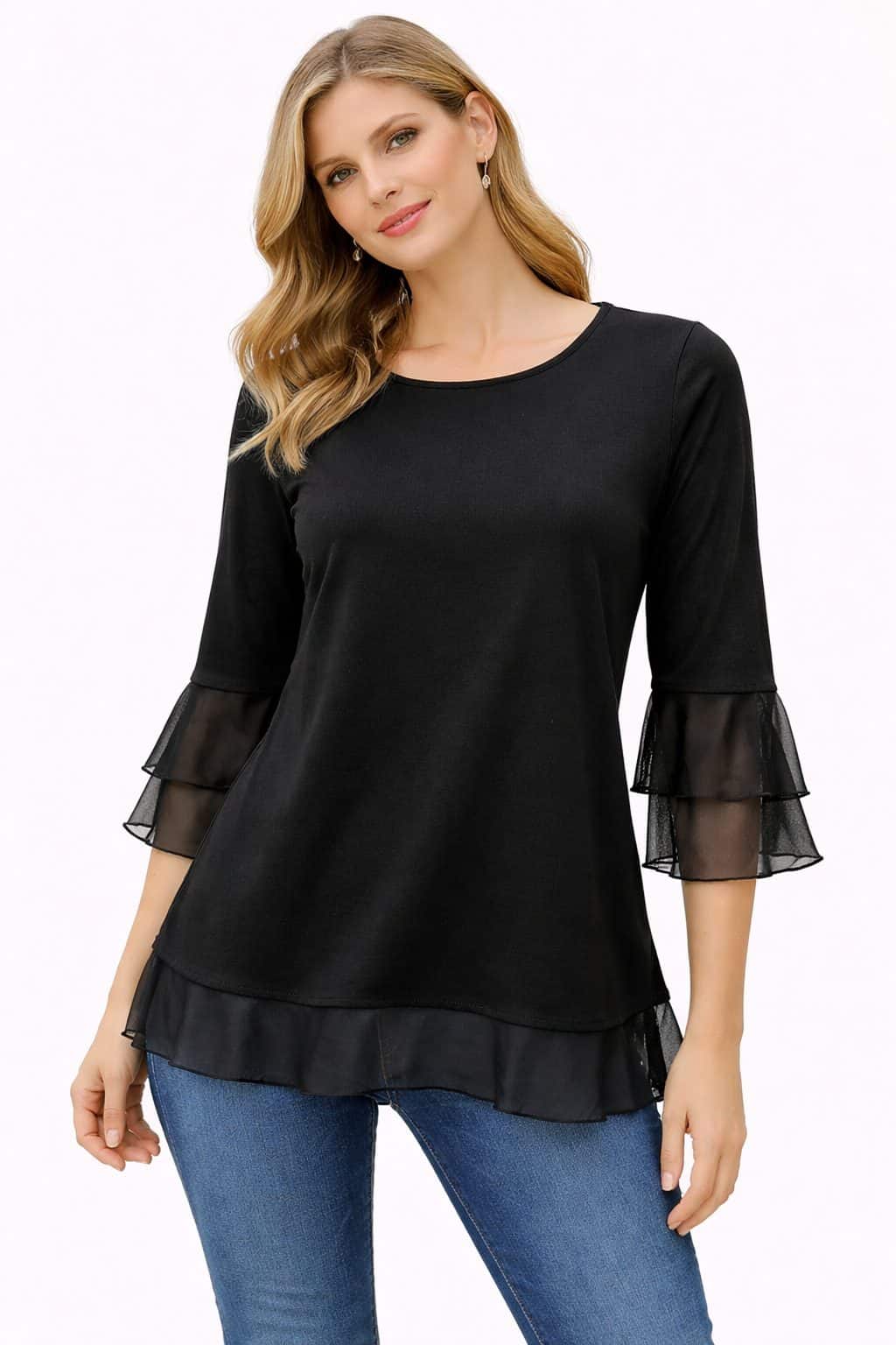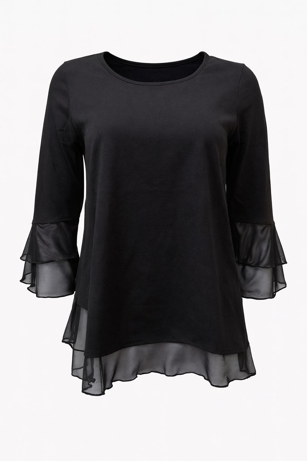 Dodaj svoji garderobi pridih elegance z našo žensko majico z volančki, ki združuje moderen dizajn in izjemno udobje. Ta elegantna majica za ženske izstopa s svojimi nežnimi prosojnimi detajli na rokavih in spodnjem robu, ki ustvarijo ženstven in sofisticiran videz.