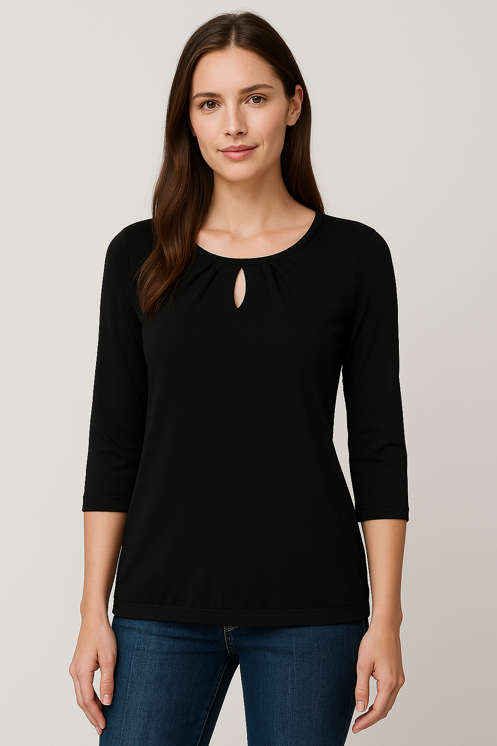 Bombažna majica s 3/4 rokavi. Majica se spodaj zaključi z elastiko, ki skirje vsako ”nepravilnost”. Spredaj ima ”solzico” in na vsako stran dve gubici. Majica je izdelana v Sloveniji. Majica je na voljo do konfekcijske velikosti 54.