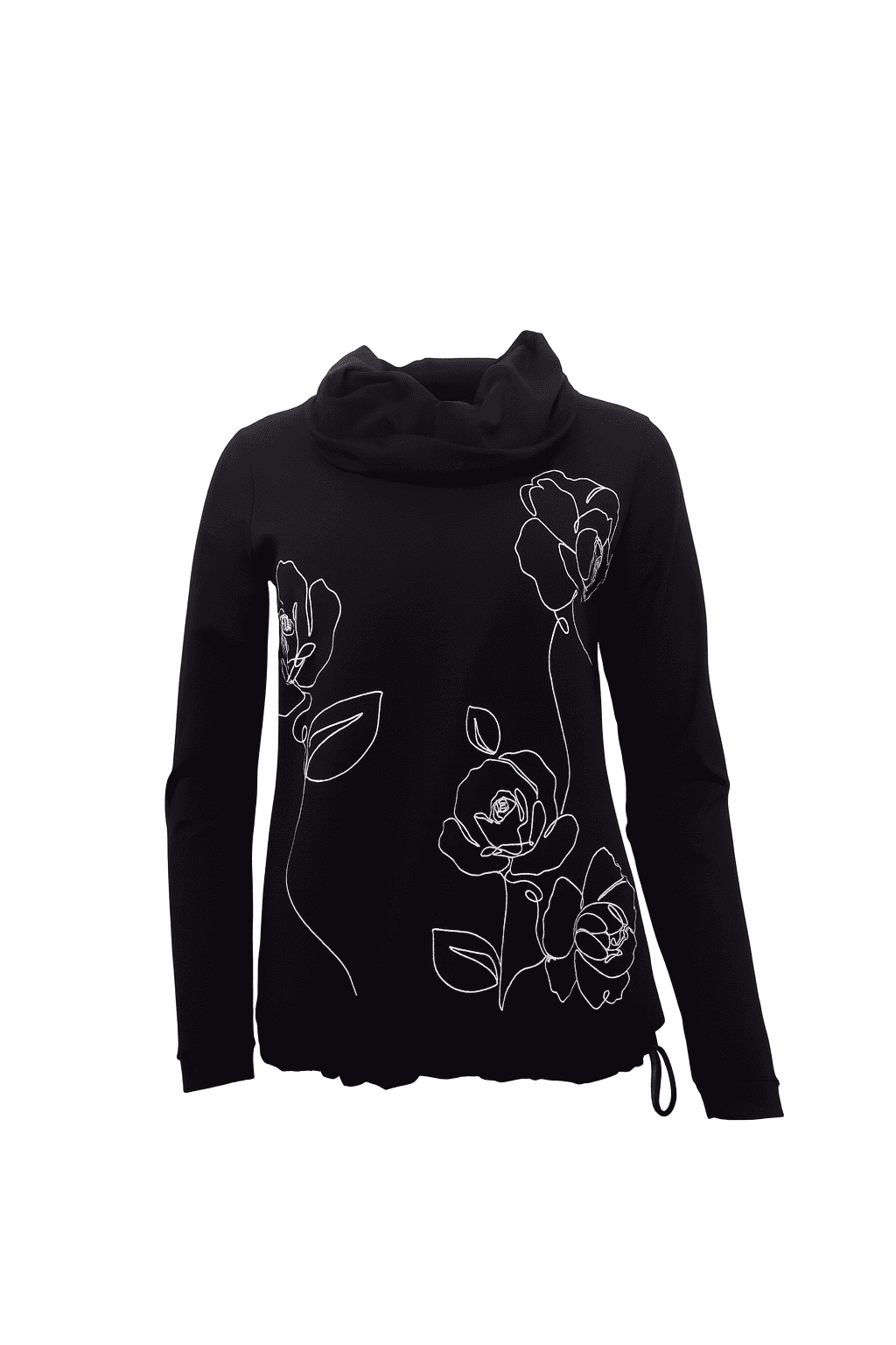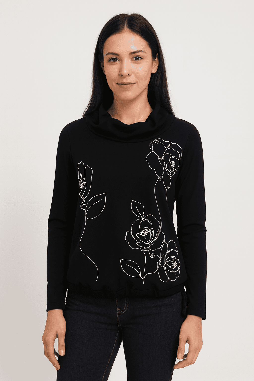 Bombažna ženska majica v črni barvi z modernim padajočim ovratnikom in umetniškim cvetličnim potiskom. Izdelana je iz prijetnega, mehkega materiala, ki zagotavlja udobje in popolno prileganje skozi ves dan.Majica z dolgimi rokavi je idealna za vsakodnevne sproščene modne kombinacije. Majica se spodaj zaveže in prilagodi po želji. Minimalističen cvetlični vzorec dodaja ženstven in prefinjen videz, zaradi česar je kos odlična izbira za vse letne čase.