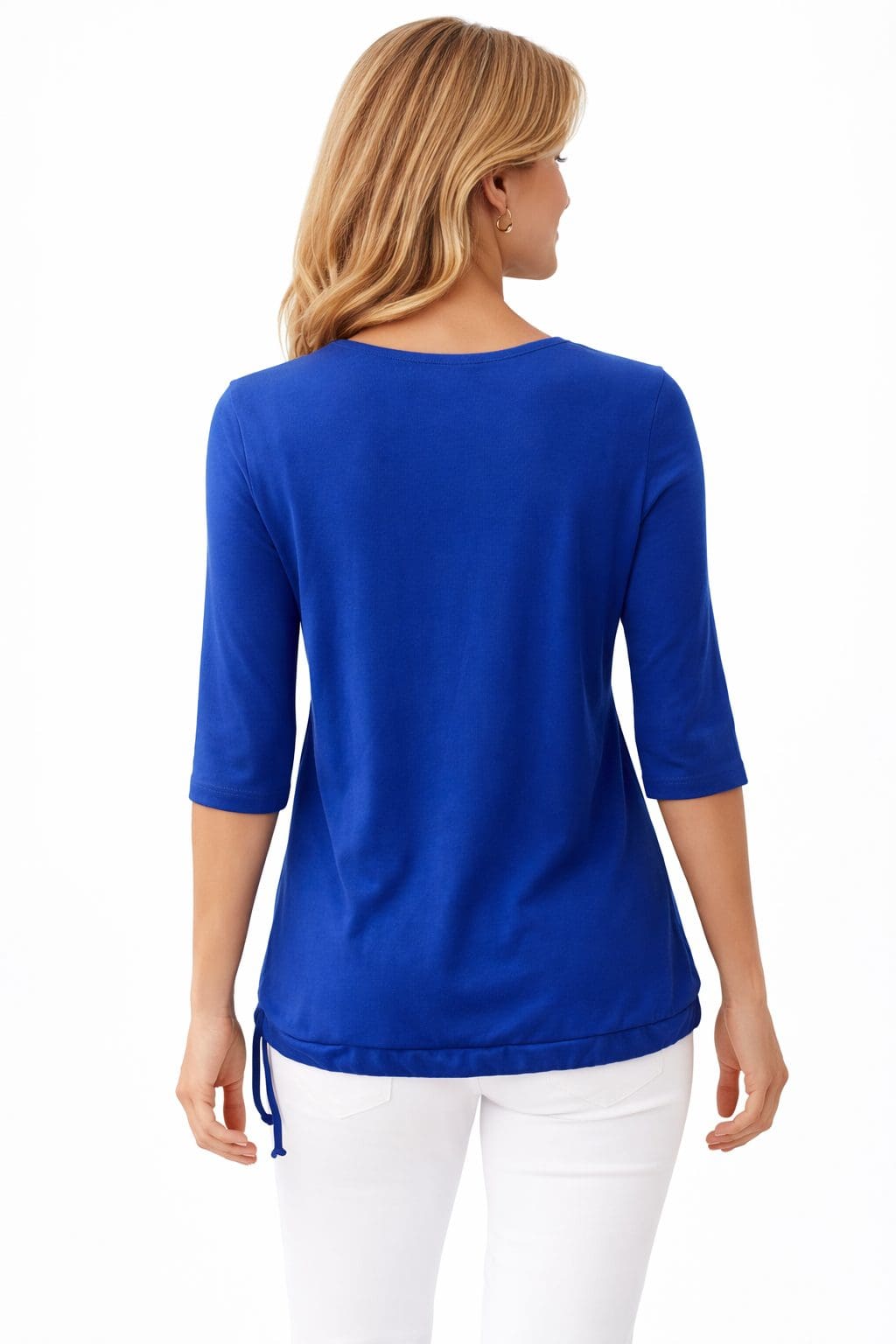 Posebnost majice je prilagodljiv spodnji rob z vrvico, ki omogoča rahlo nabran videz in popolno prileganje tvoji postavi. Mehki in zračni material poskrbi za udobno nošenje skozi ves dan, zato je odlična izbira kot majica za vsak dan ali sproščene priložnosti.