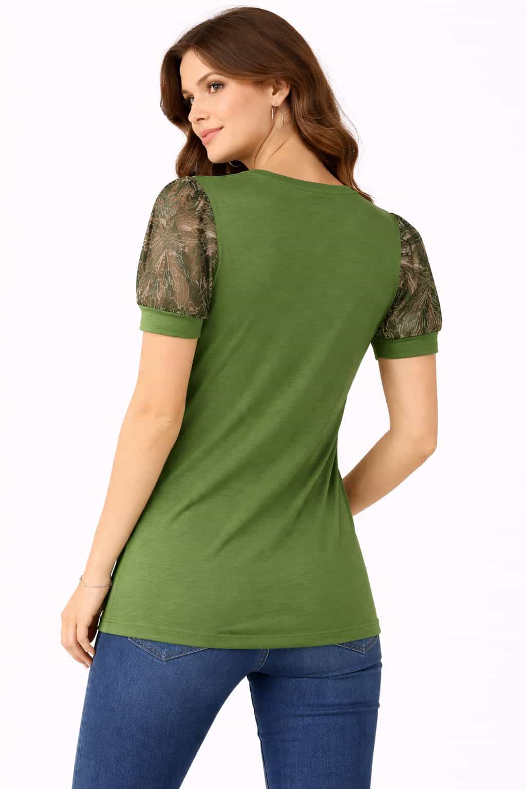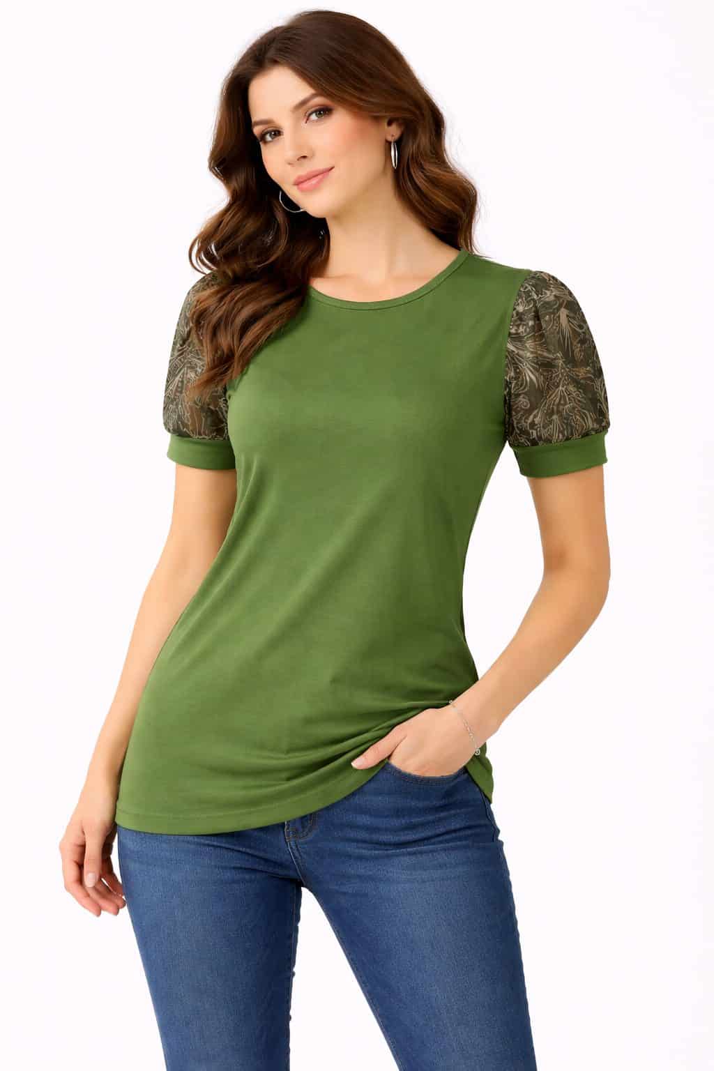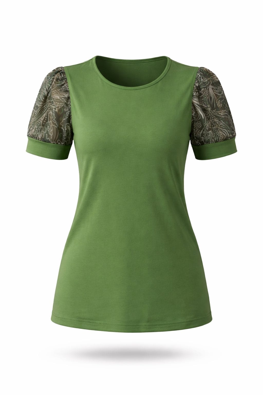 Odkrij elegantno in ženstveno žensko majico s kratkimi rokavi, ki združuje udobje in moderen videz. Majica je izdelana iz mehkega in prijetnega materiala, ki lepo pade ob telesu in zagotavlja celodnevno udobje. Posebnost majice so rahlo prosojni rokavi z nežnim cvetličnim ali vzorčnim potiskom, ki dodajo pridih prefinjenosti in unikatnosti.