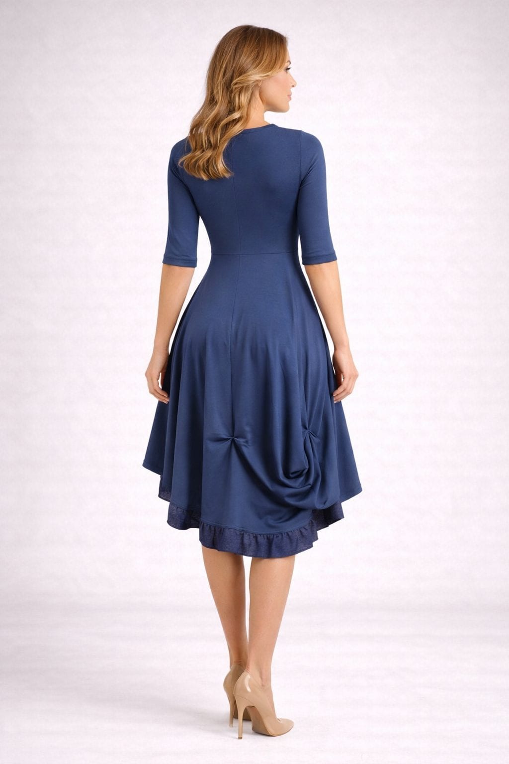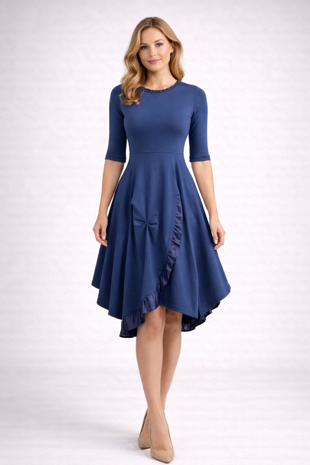 Elegantna obleka z asimetričnim krilom je popolna izbira za ženske, ki cenijo brezčasno eleganco in sodoben dizajn. Obleka ima oprijet zgornji del s kratkimi rokavi, ki lepo poudari postavo, ter ženstveno krilo z nežnimi gubami in asimetričnim robom, okrašenim s subtilnim sijajnim detajlom.