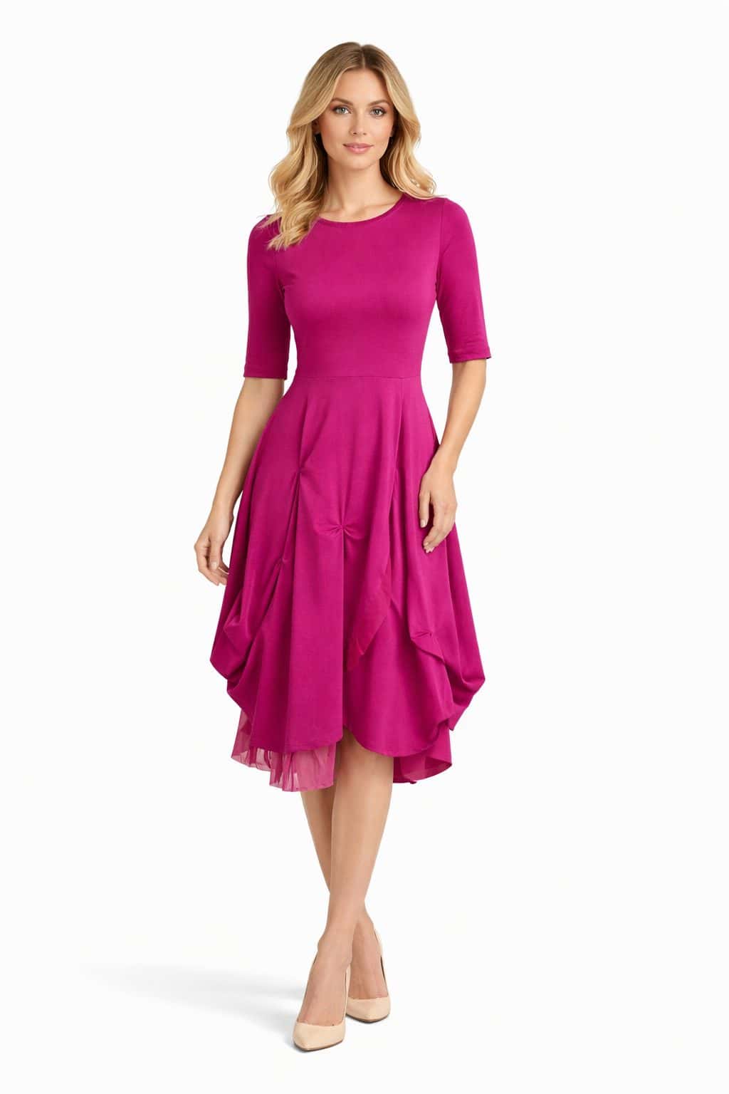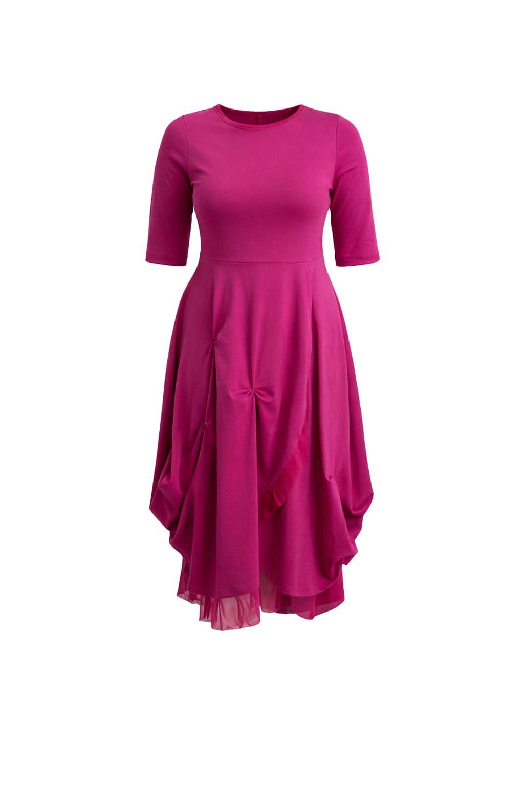 Elegantna obleka z asimetričnim krilom je popolna izbira za ženske, ki cenijo brezčasno eleganco in sodoben dizajn. Obleka ima oprijet zgornji del s kratkimi rokavi, ki lepo poudari postavo, ter ženstveno krilo z nežnimi gubami in asimetričnim robom, okrašenim s subtilnim sijajnim detajlom.