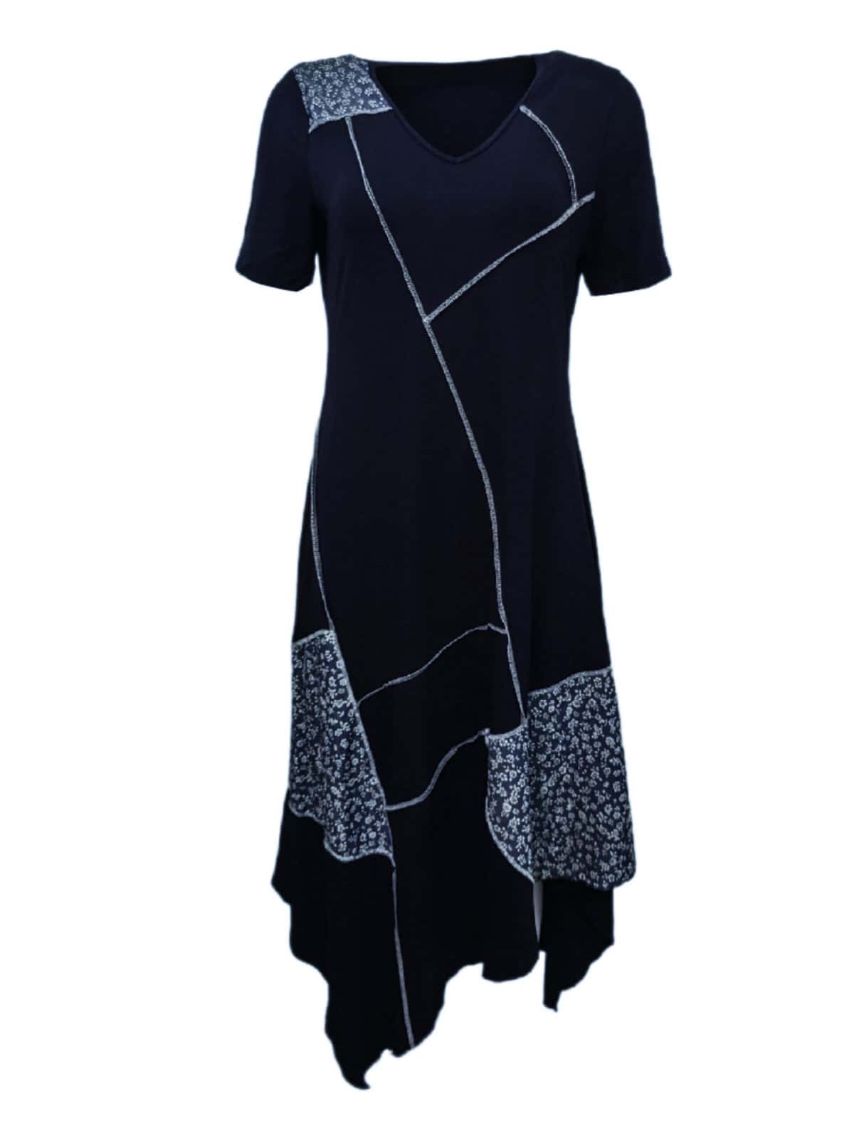 Čudovita viskozna obleka EVIJA. Obleka ima V izrez in zunanje šive. Obleka lepo pade in je kombinirana s potiskanim materialom.