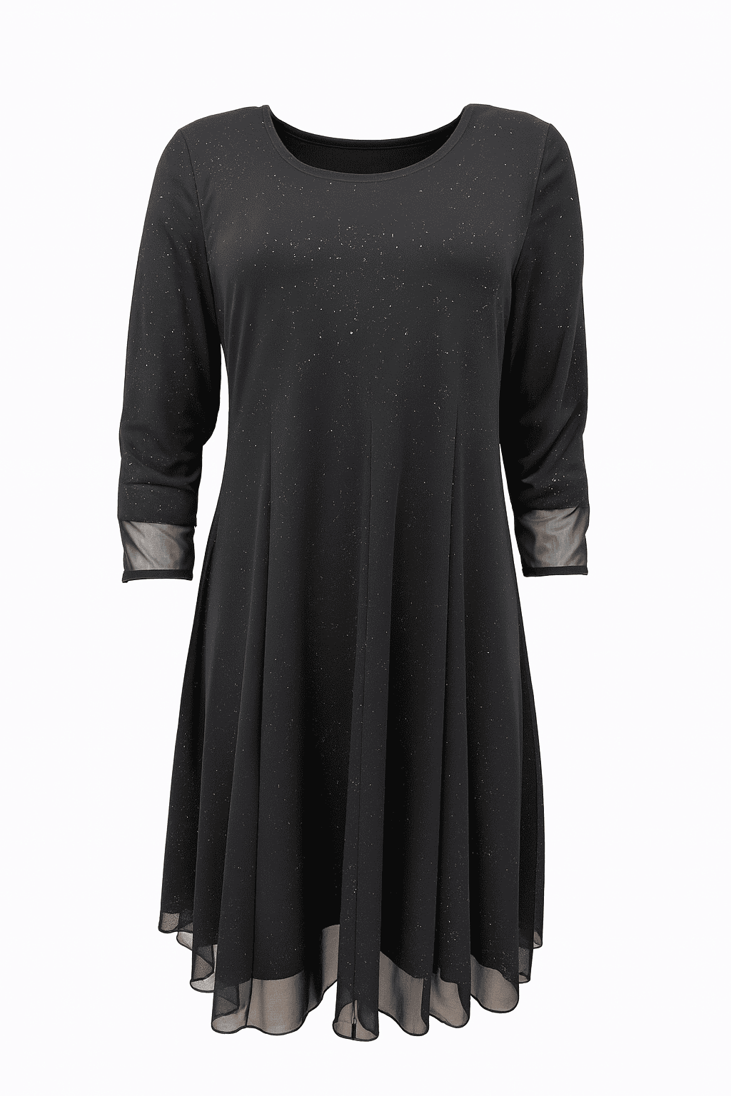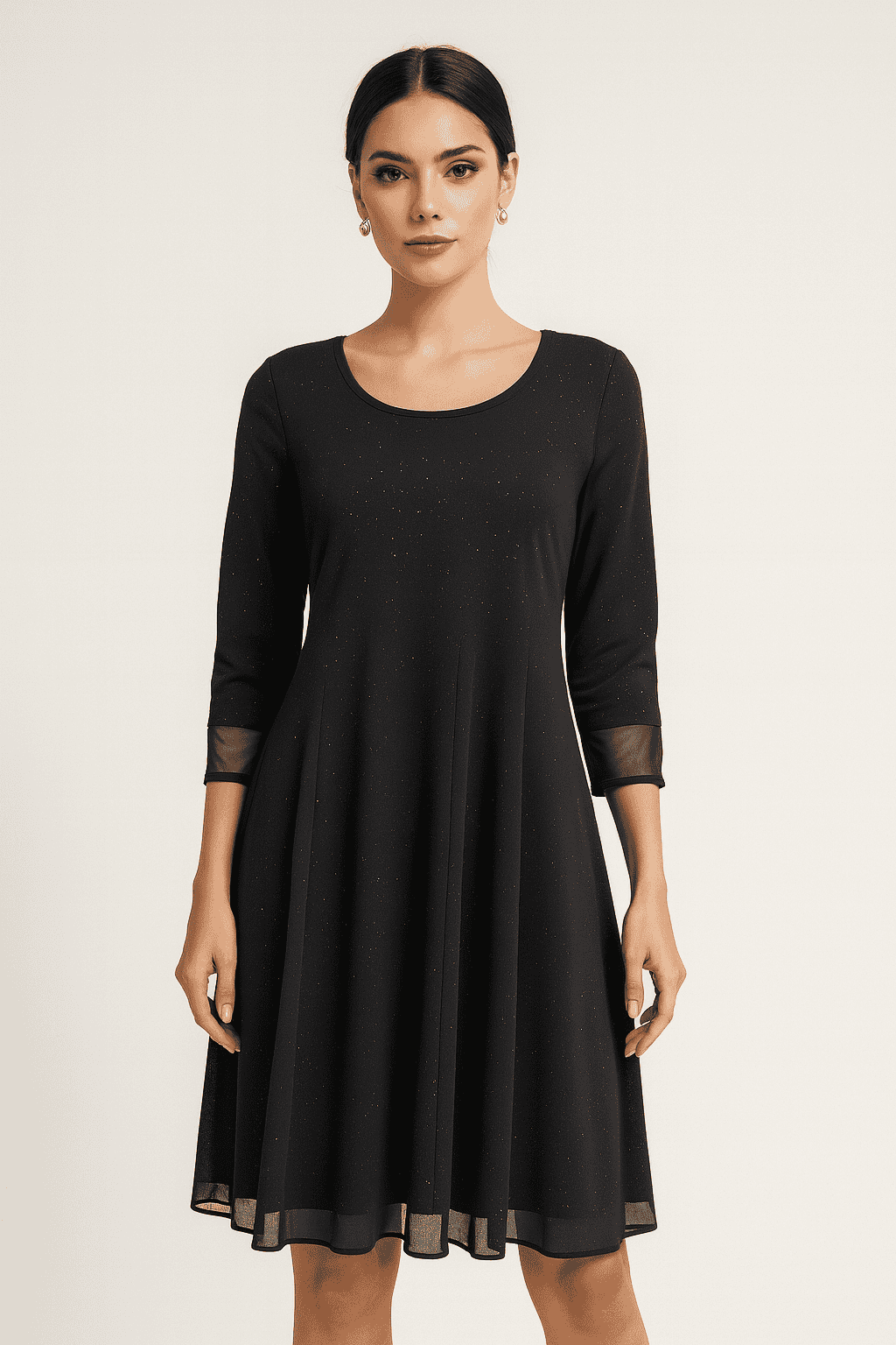 Ta čudovita črna A-linijska obleka z bleščečimi pikami je idealna za vse, ki iščete kombinacijo udobja, elegance in sodobnega stila. Izdelana je iz lahkega, padajočega materiala, ki lepo oblikuje postavo in zagotavlja prijeten občutek skozi ves dan. Trikraten rokav dopolnjuje subtilen prosojen vložek, ki obleki doda prefinjeno noto.