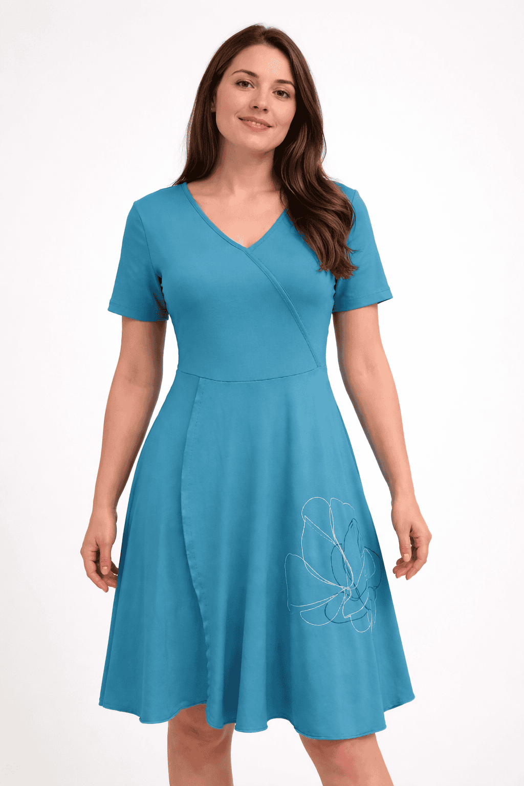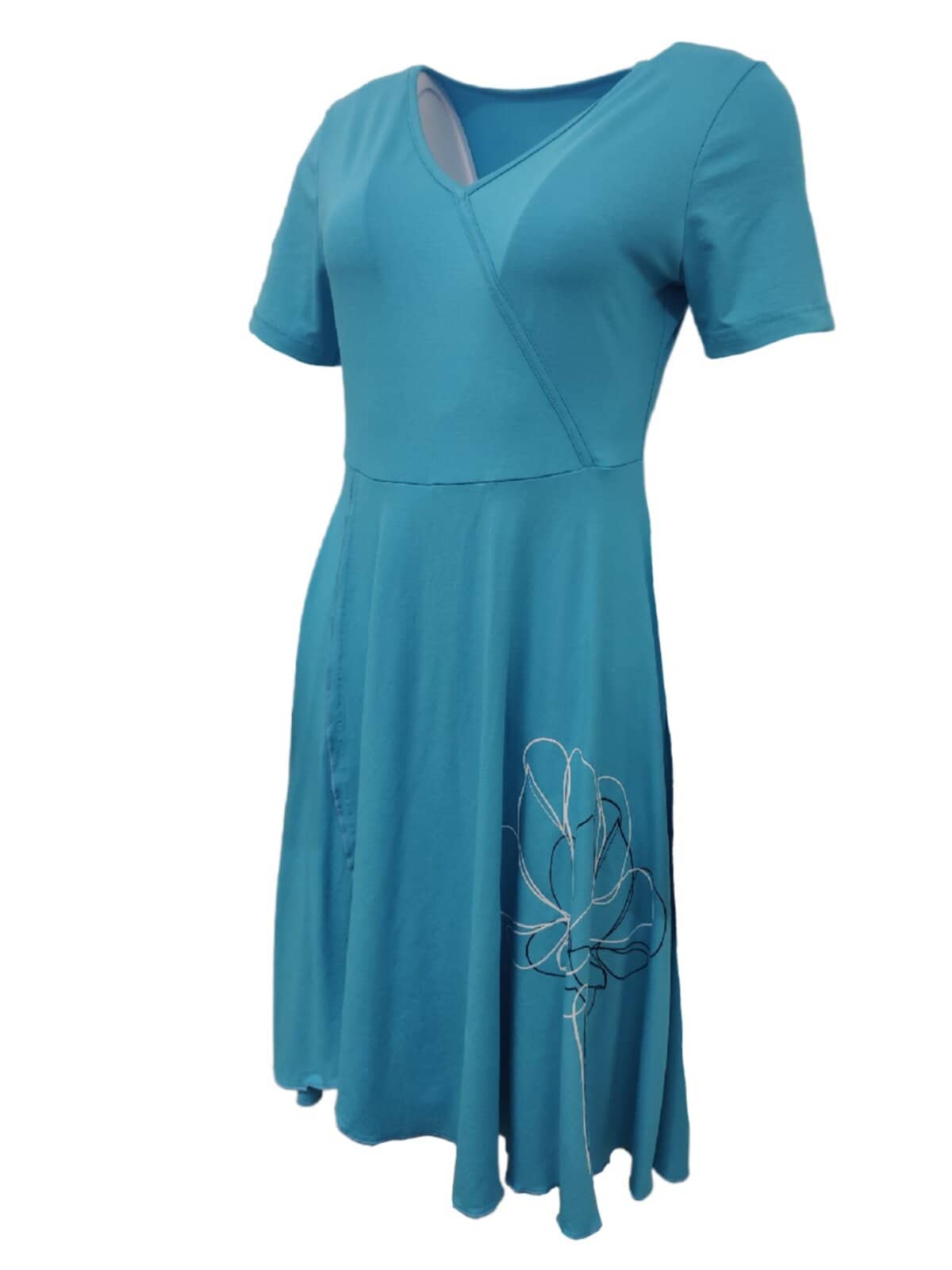 Čudovita viskozna obleka NEJA. Obleka ima V izrez na preklop, ki je zašit.. Obleka je zgoraj telirana, spodaj pa lepo pade na ven. Obleka je na voljo od konfekcijske velikosti 36 do 46. Obleka je izdelana v Sloveniji.