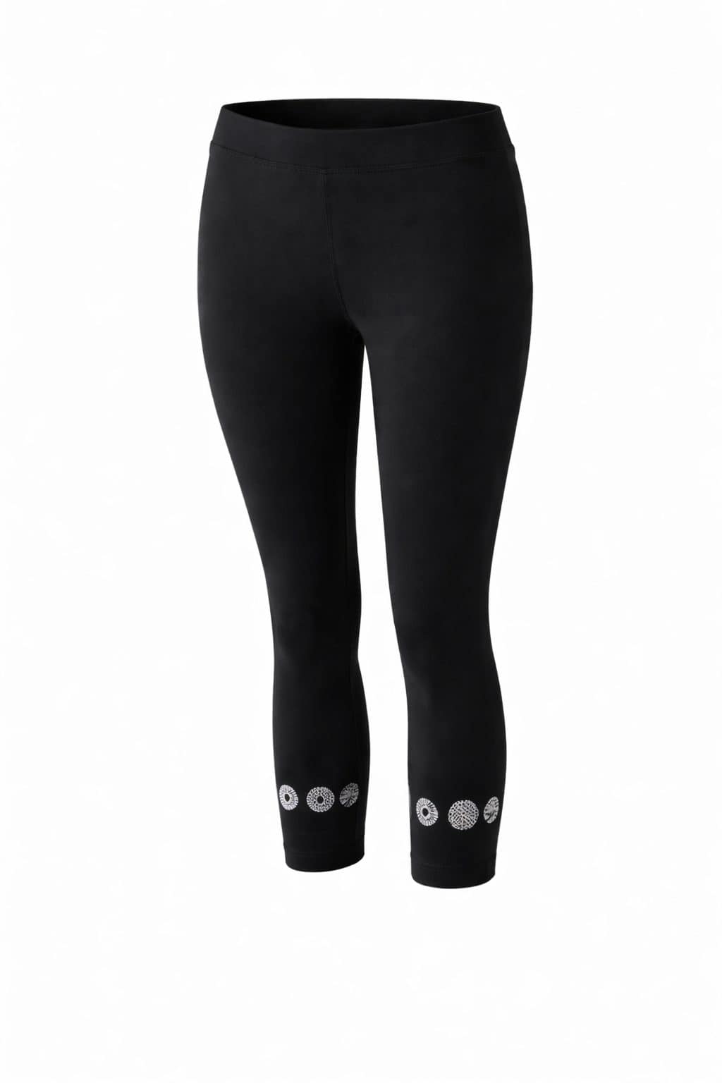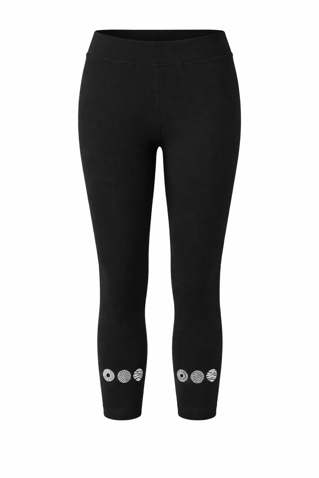 Črna barva in dekorativen tisk na spodnjem delu hlačnic ustvarjata moderen videz, ki ga enostavno kombinirate s tunikami, majicami ali športnimi copati. Pajkice segajo do sredine meč oziroma do gležnjev, zato so odlična izbira za pomladne in poletne dni.