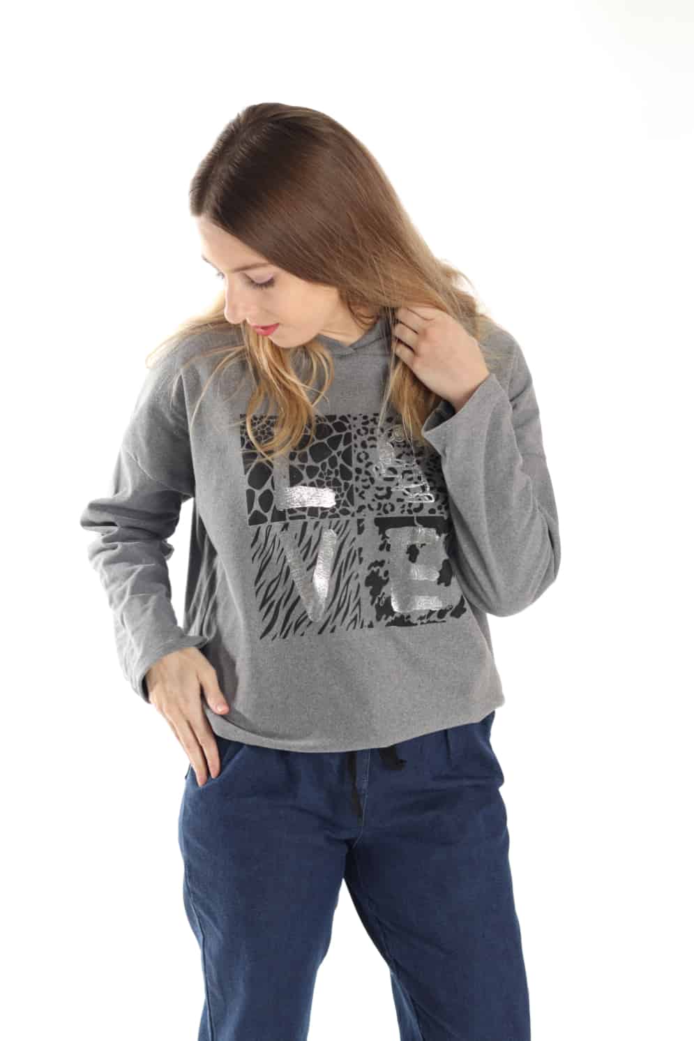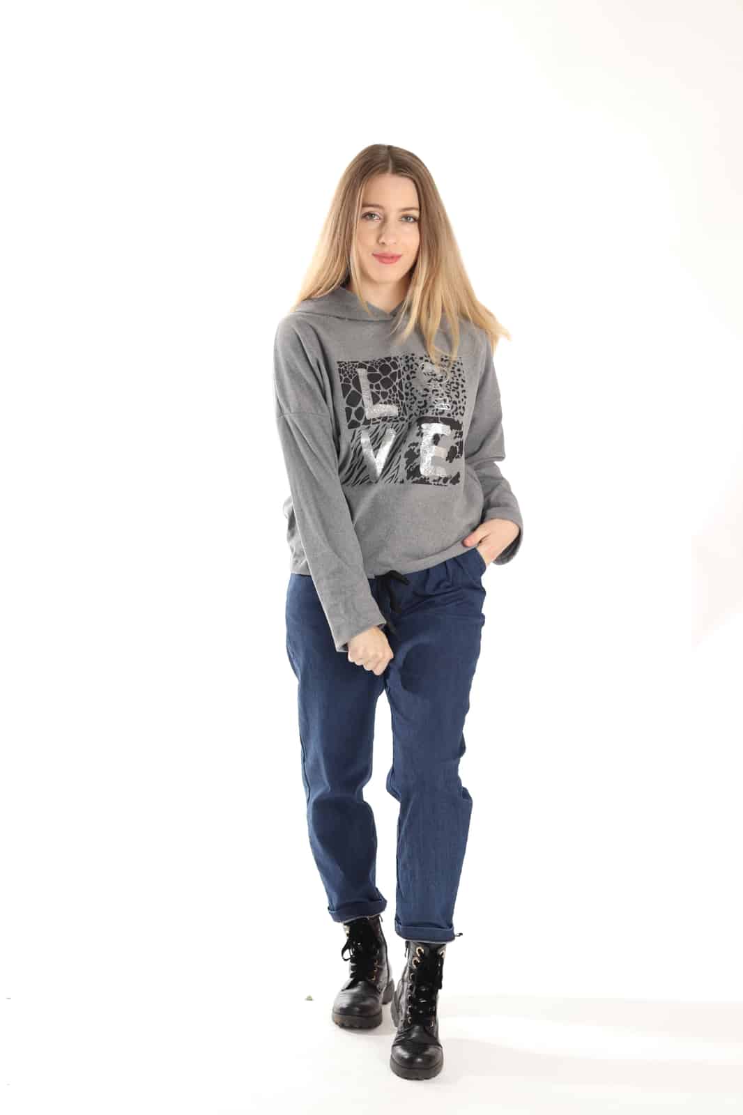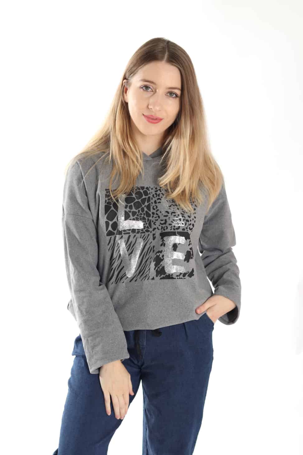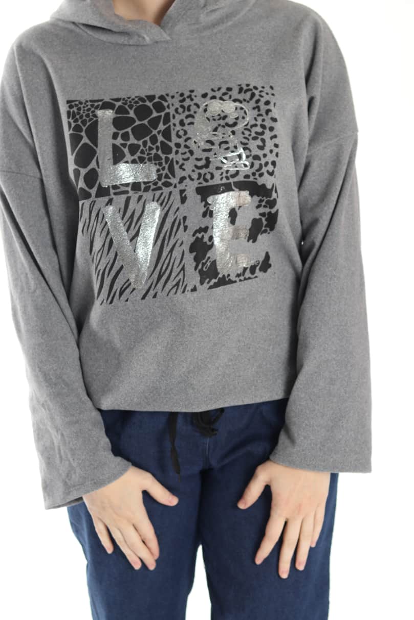 Udoben pulover s kapuco. Pulover je narejen iz bombaža in ima na sprednji strani natisnjene kvadratke s potiskom različnih vzorcev, ki tvorijo napis LOVE. Pulover se spodaj stisne z elastično vrvico. Pulover je na voljo v sivi, zeleni in rjavi barvi.