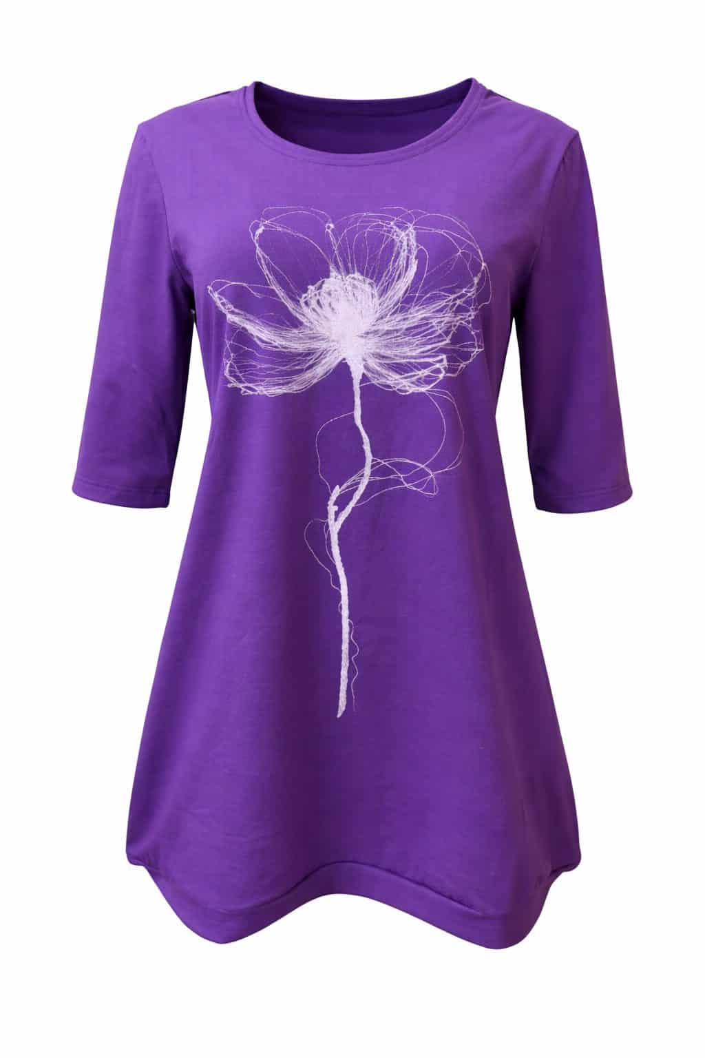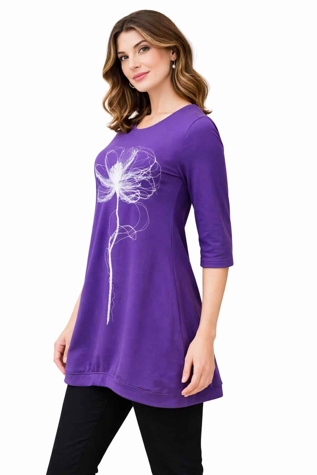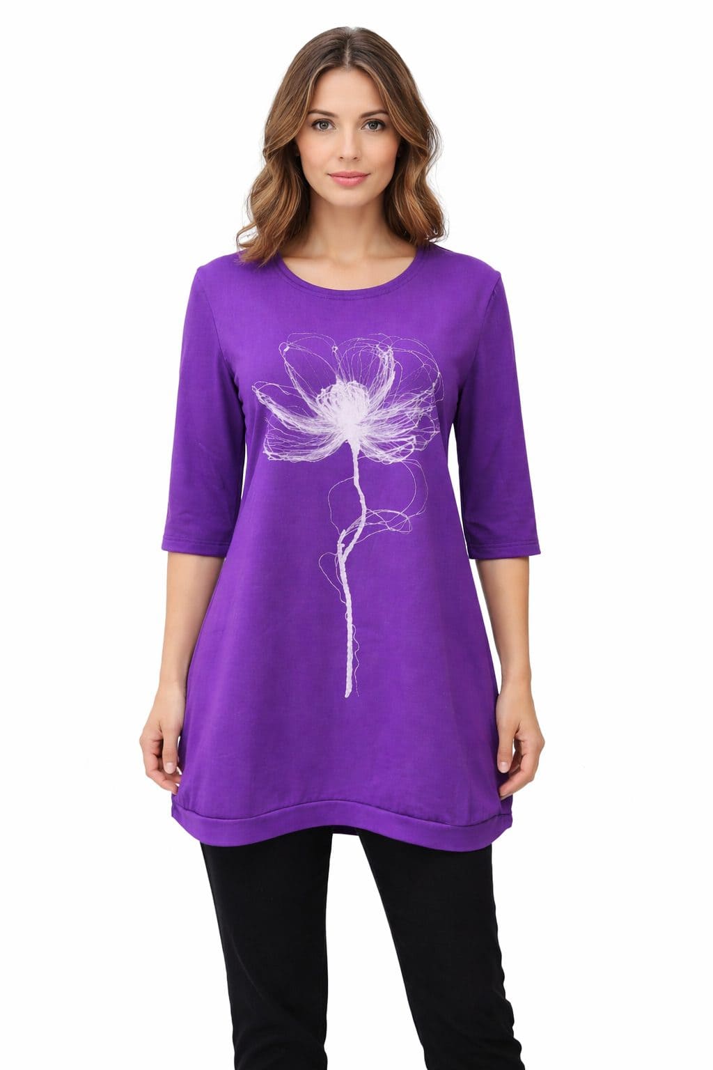 Mehka in prijetna tkanina zagotavlja udobno nošenje skozi ves dan, medtem ko rahlo razširjen kroj lepo pade na postavo in ustvarja laskavo silhueto. Unikaten grafični potisk rože daje tuniki poseben, umetniški pridih, ki izstopa v vsaki kombinaciji.