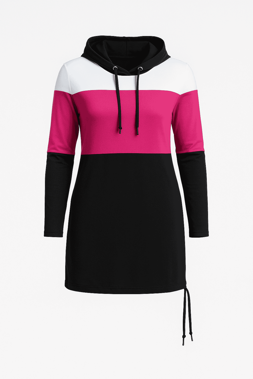 Ta modna ženska tunika s kapuco v udarni kombinaciji bele, intenzivne fuksija roza in črne barve je popolna izbira za vse, ki želijo združiti udobje in samozavesten stil. Color-block dizajn ustvarja sodoben, izstopajoč videz, ki se poda tako športno-elegantnim kot sproščenim kombinacijam.