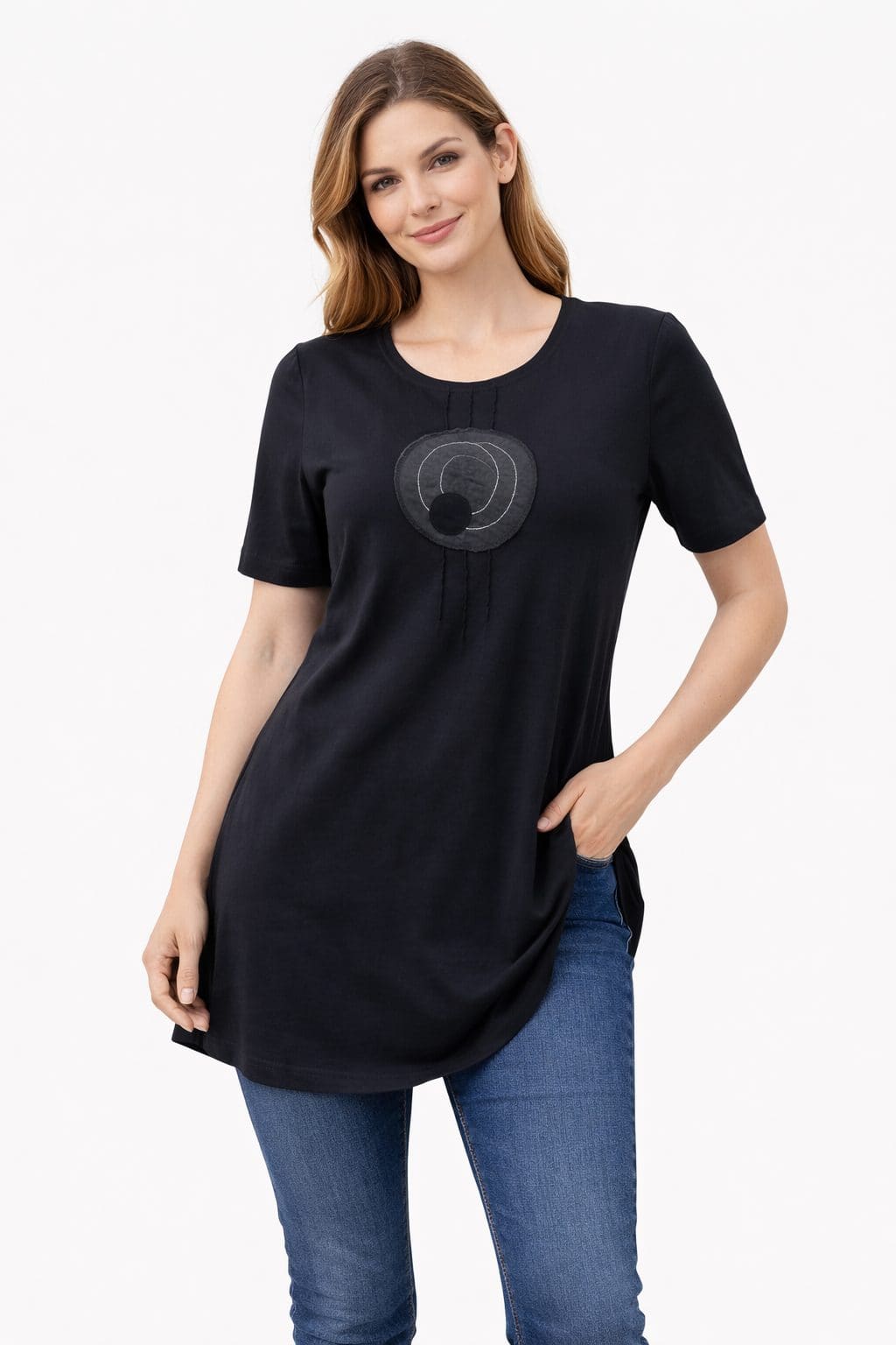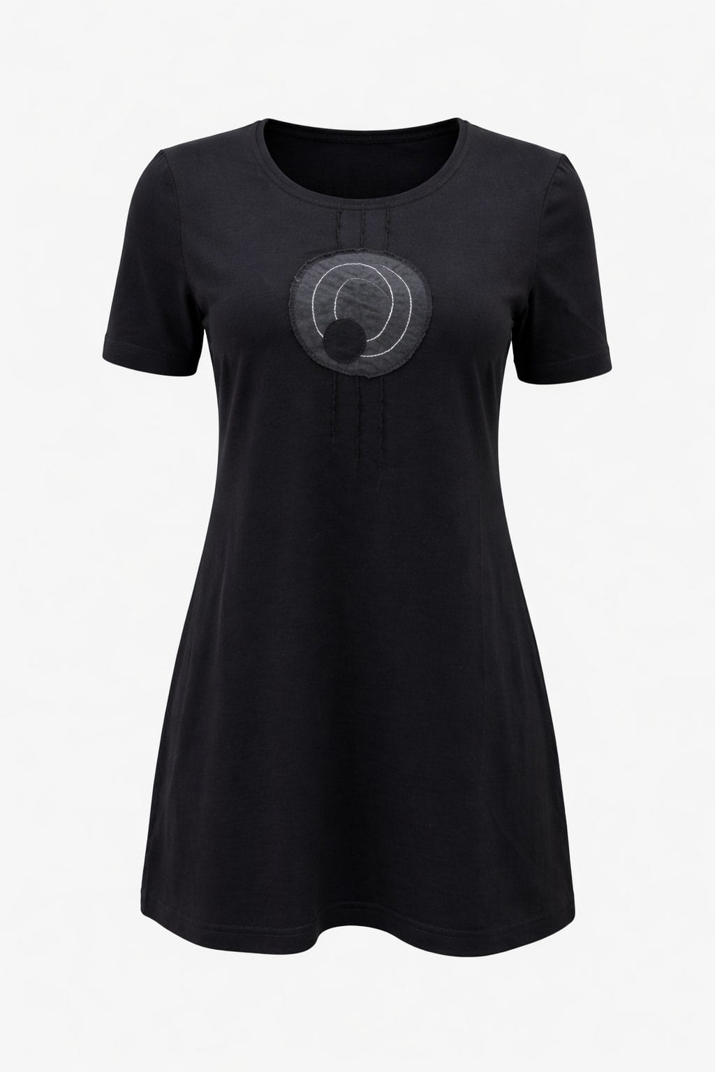 Odkrij popolno kombinacijo udobja in elegance. Ženska tunika s kratkimi rokavi, ki je idealna izbira za vsakodnevno nošenje ali posebne priložnosti. Ta moderna tunika za ženske navdušuje s svojim minimalističnim dizajnom in unikatnim okroglim detajlom na prsnem delu, ki doda pridih sofisticiranosti.