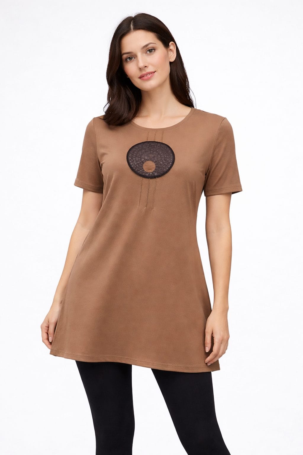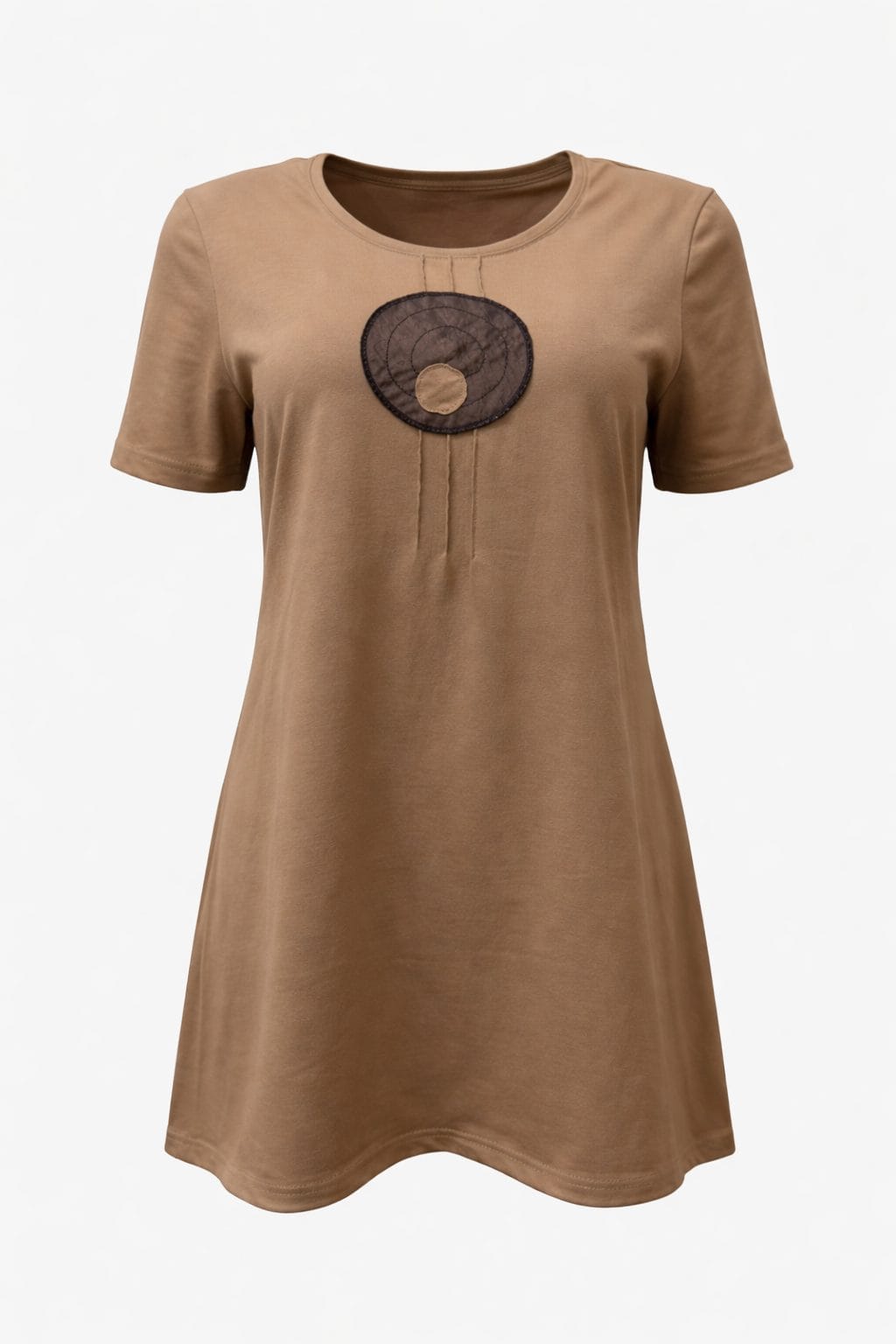 Odkrij popolno kombinacijo udobja in elegance. Ženska tunika s kratkimi rokavi, ki je idealna izbira za vsakodnevno nošenje ali posebne priložnosti. Ta moderna tunika za ženske navdušuje s svojim minimalističnim dizajnom in unikatnim okroglim detajlom na prsnem delu, ki doda pridih sofisticiranosti.