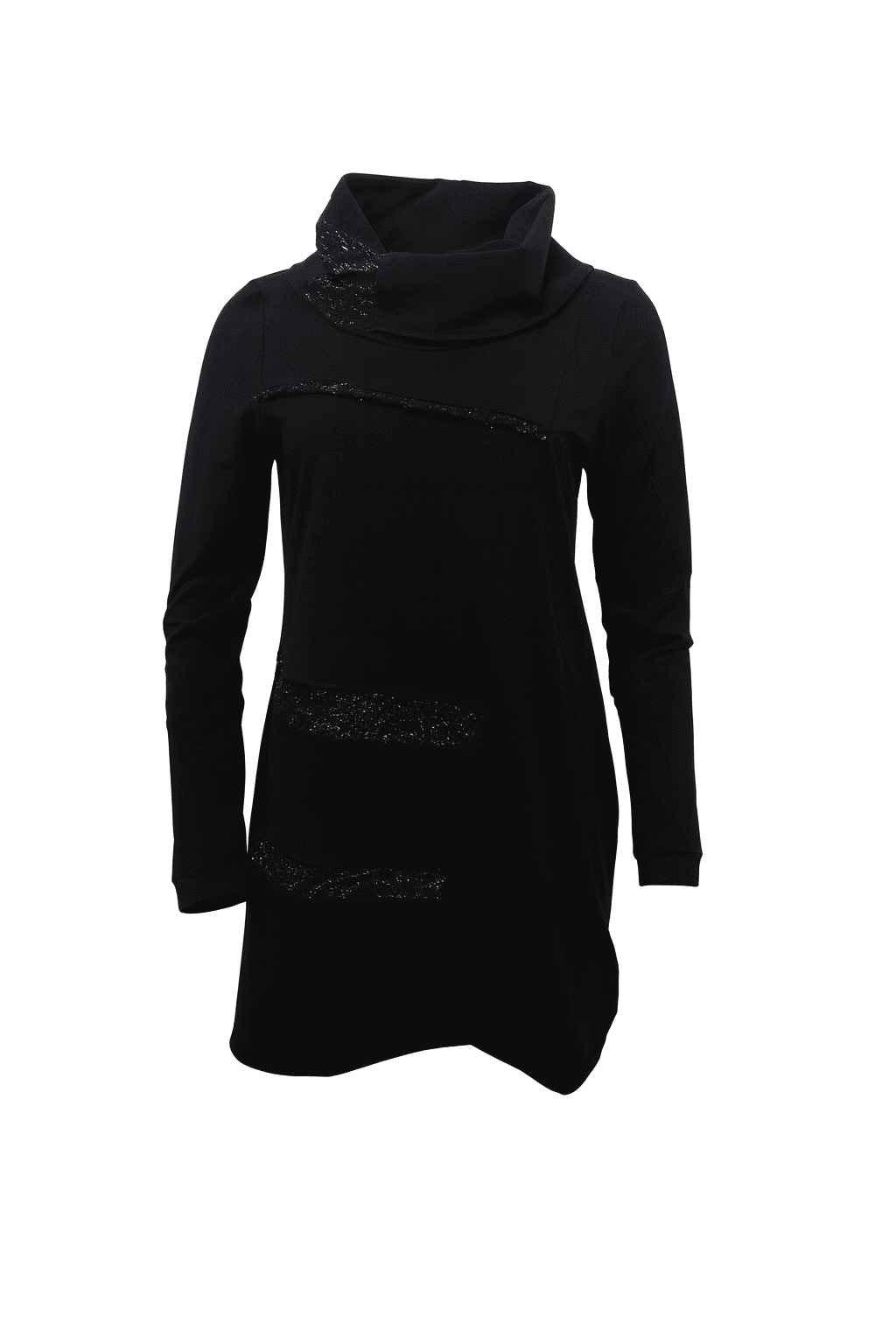 Elegantna črna tunika z črnim svetlečim dodatkom je odlična izbira za ženske, ki želijo združiti udobje in sodoben stil. Iz mehke in prijetne tkanine zagotavlja izjemno udobje skozi ves dan. Asimetričen kroj optično podaljša postavo, visoka ovratna ovratnica z živalskim potiskom pa doda pridih sofisticiranosti. Dekorativni črni trakovi na sprednjem delu ustvarijo moden, urbani videz, zaradi česar je tunika popolna za vsakodnevne priložnosti, delo ali sproščene večerne izhode. Enostavno se kombinira s kavbojkami, pajkicami ali elegantnimi hlačami. Izberite tuniko, ki poudari vaš edinstven stil in doda karakter vsaki opravi.