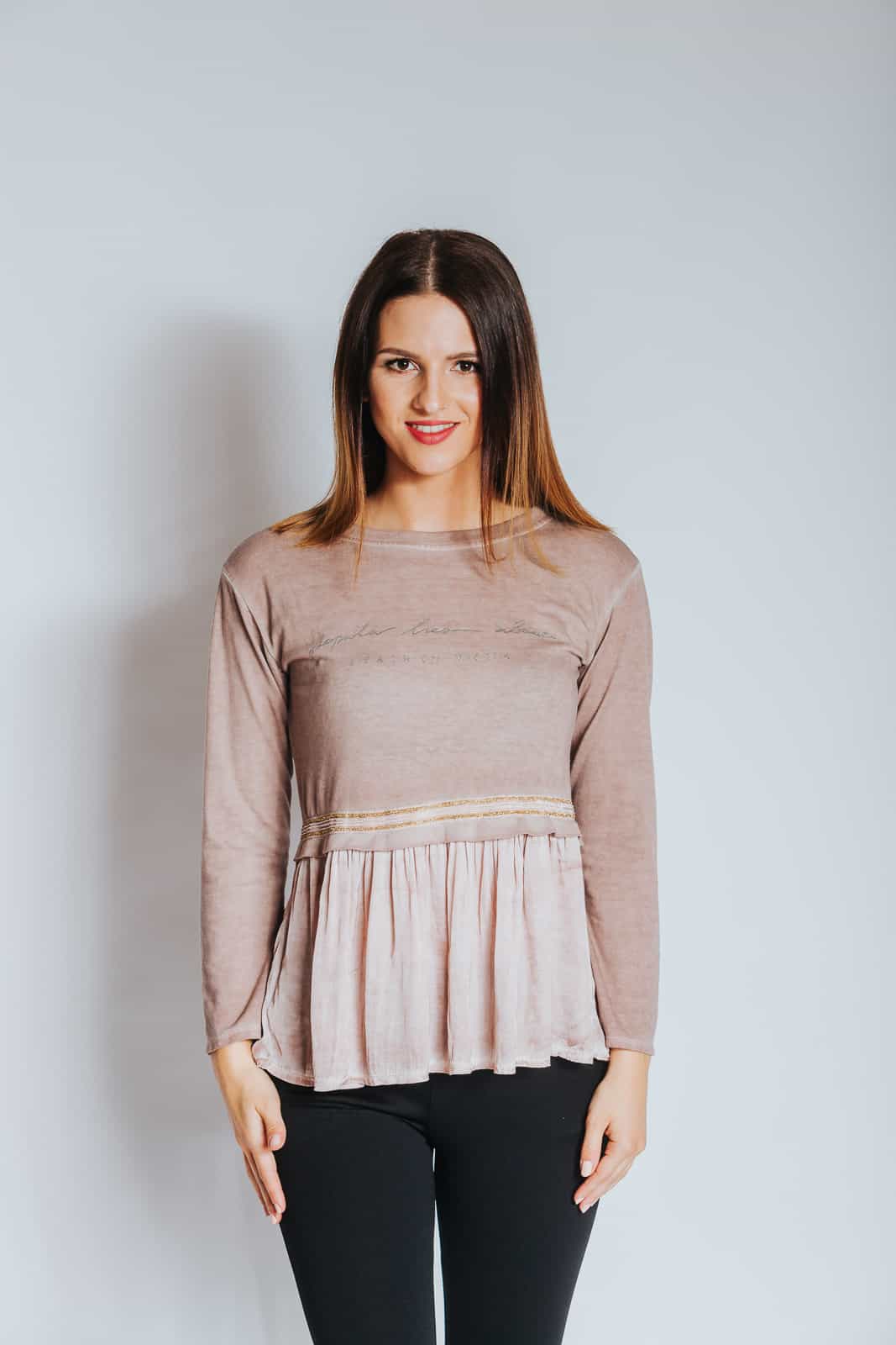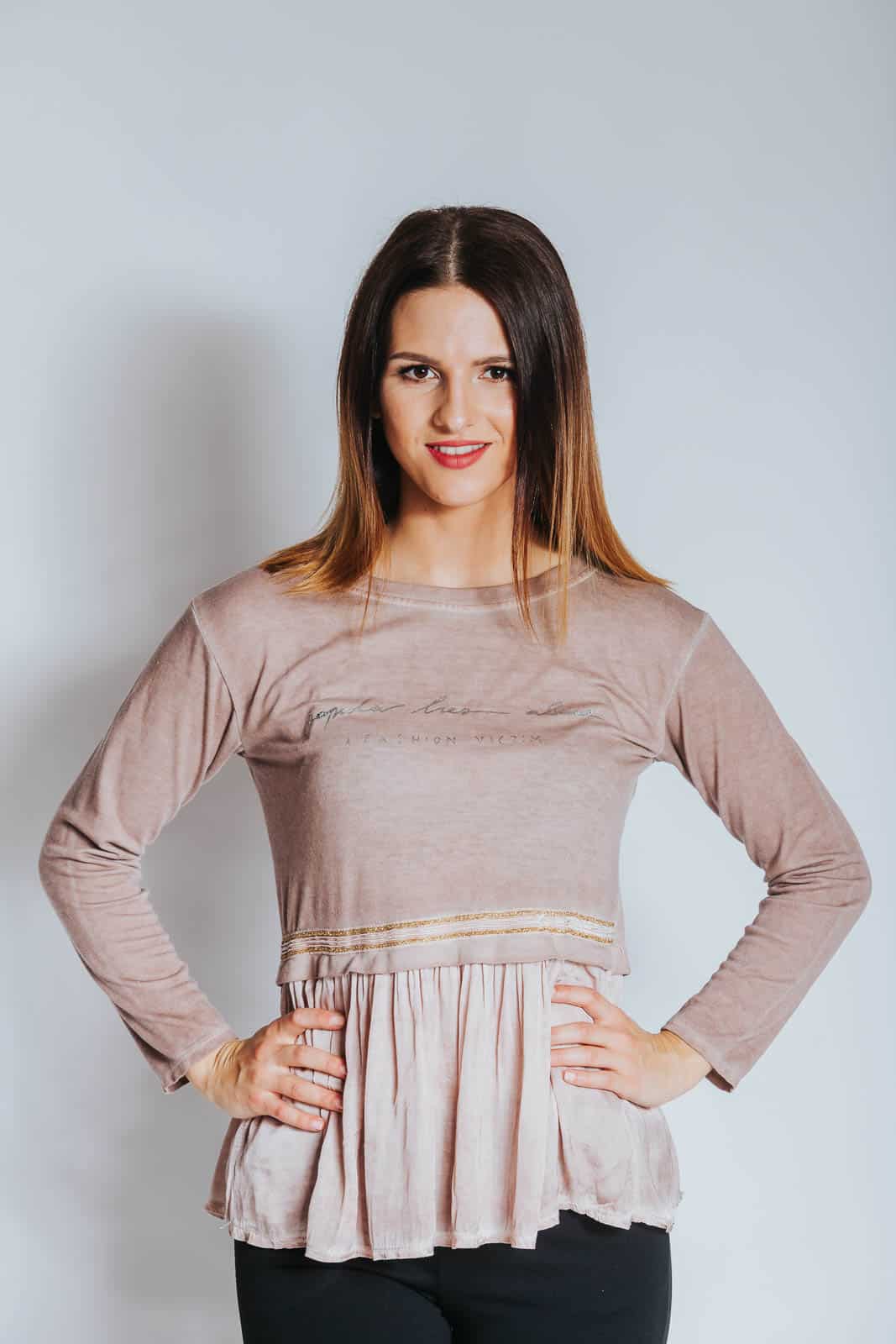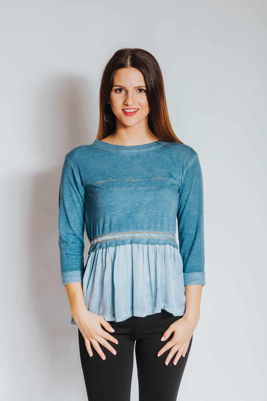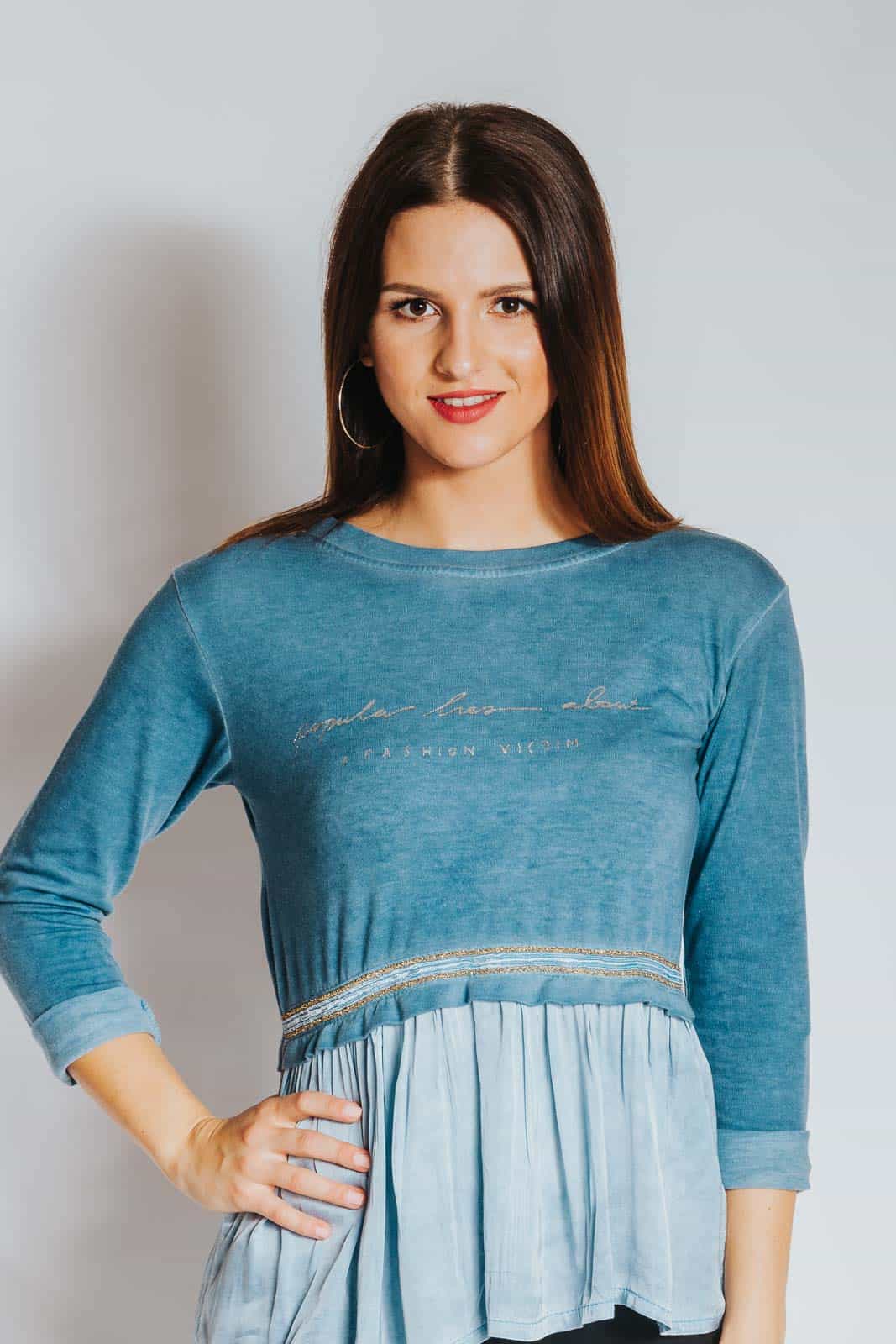 Ženska majica z napisom in prikupnimi detalji bo popestrila vaš izgled. V zgornjem delu je majica z volančki oprijeta, v spodnjem pa blago lahkotno pada in ustvarja ljubek videz. Majica je prijetna, udobna in hkrati privlačna za oko. Na voljo je v modri in roza barvi.