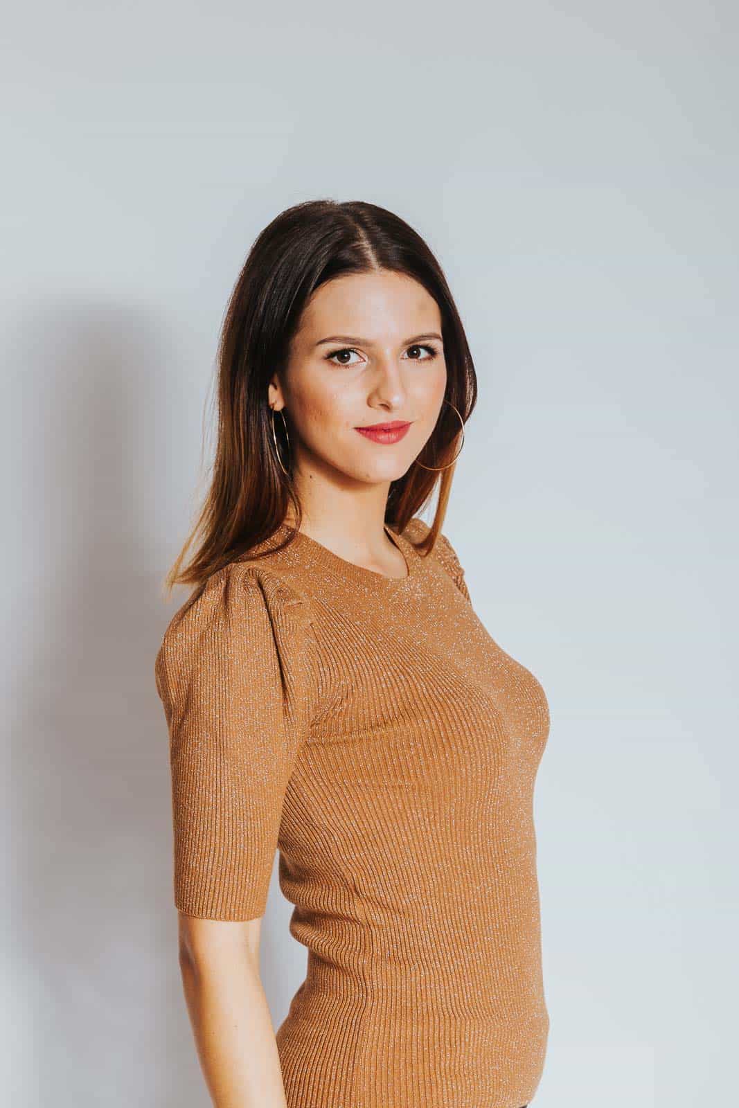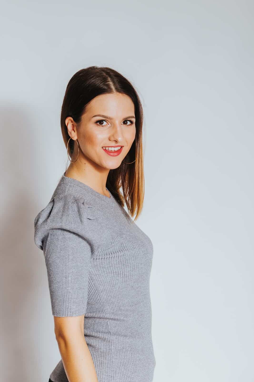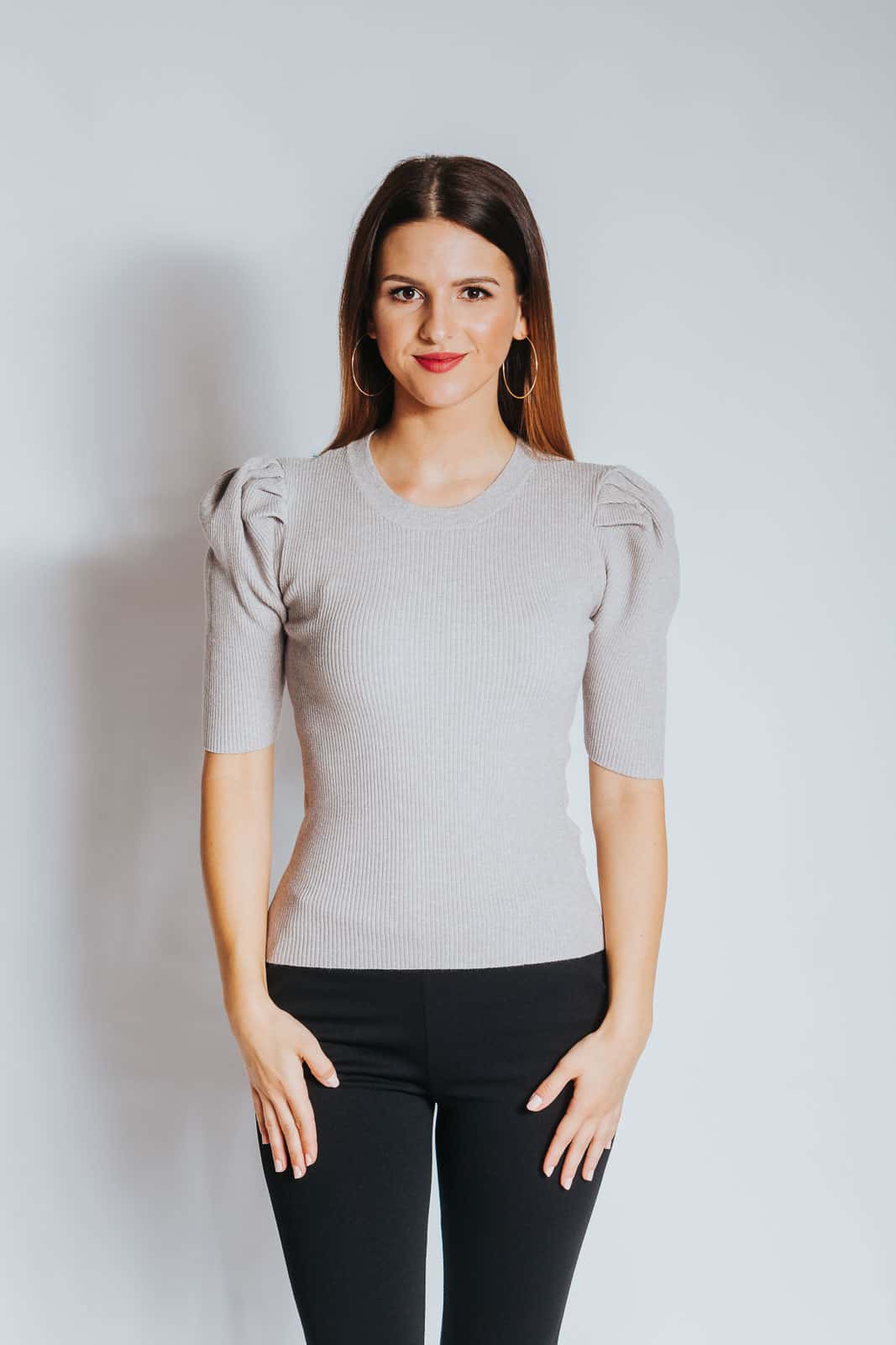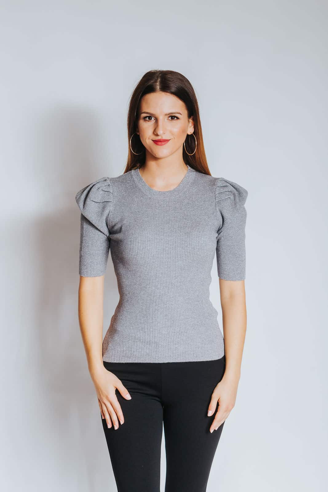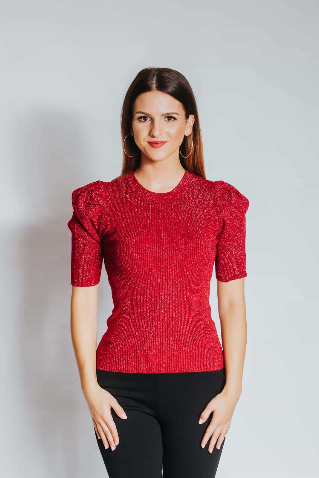 Rahlo napihnjena ramena in svetleči material naredita ta pulover ženstven, eleganten in tudi svečan. Tkanina, rebrastega izgleda, se odlično prilega postavi, je lahka in izredno prijetna na otip. Pulover je na voljo v črni, sivi, bež, rdeči in zlati barvi.